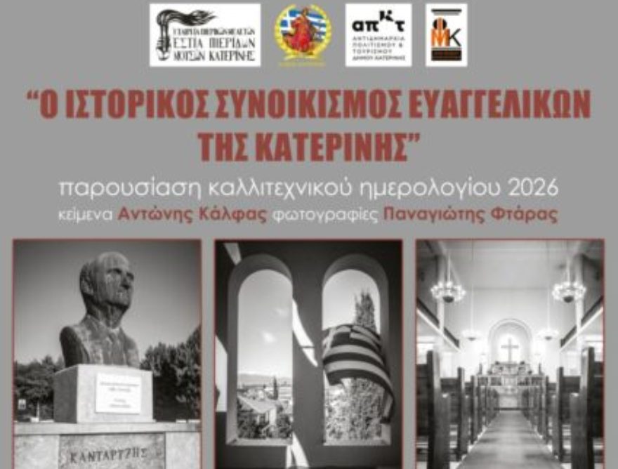 H Αντιδημαρχία Πολιτισμού του Δήμου Κατερίνης, οι Φίλοι του Μουσείου Πόλης Κατερίνης, η Εστία Πιερίδων Μουσών Κατερίνης και οι εκδόσεις Οξύνοια σας προσκαλούν στην παρουσίαση του καλλιτεχνικού ημερολογίου 2026 “Ο ΙΣΤΟΡΙΚΟΣ ΣΥΝΟΙΚΙΣΜΟΣ ΕΥΑΓΓΕΛΙΚΩΝ ΤΗΣ ΚΑΤΕΡΙΝΗΣ”, με εμπεριστατωμένα κείμενα-σχόλια του ποιητή, φιλόλογου, ερευνητή της τοπικής ιστορίας Αντώνη Κάλφα και 37 καλλιτεχνικές φωτογραφίες του καλλιτεχνικού φωτογράφου Παναγιώτη Φτάρα. Για το βιβλίο […]