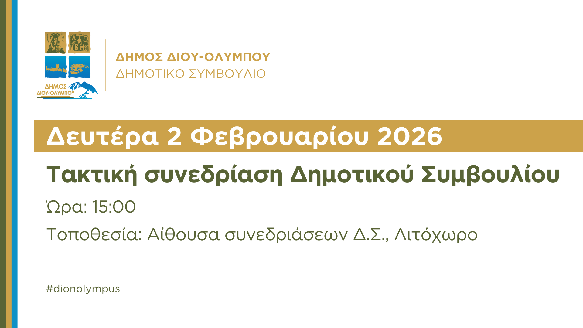 Πρόσκληση & θέμα ημερήσιας διάταξης της τακτικής συνεδρίαση του Δ.Σ. Δίου-Ολύμπου τη Δευτέρα 2 Φεβρουαρίου 2026