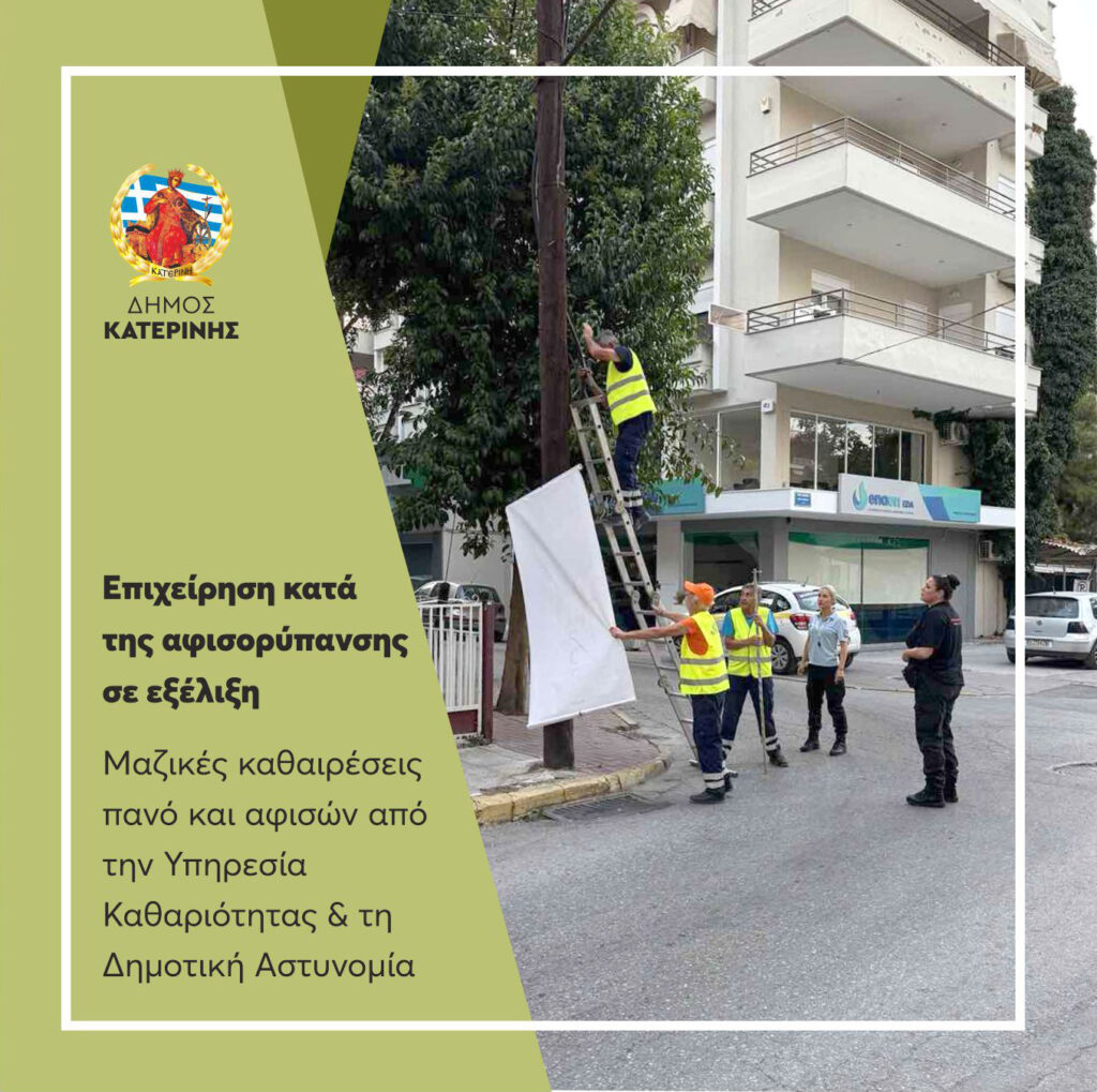 Σε πλήρη εξέλιξη εκτεταμένη επιχείρηση απομάκρυνσης αφισών και διαφημιστικών μπάνερς από τους δρόμους της Κατερίνης, με ενέργειες της Υπηρεσίας Καθαριότητας και της Δημοτικής Αστυνομίας. Σήμερα απομακρύνθηκαν 139 διαφημιστικά μπάνερς και δεκάδες αφίσες από διάφορα σημεία της πόλης.