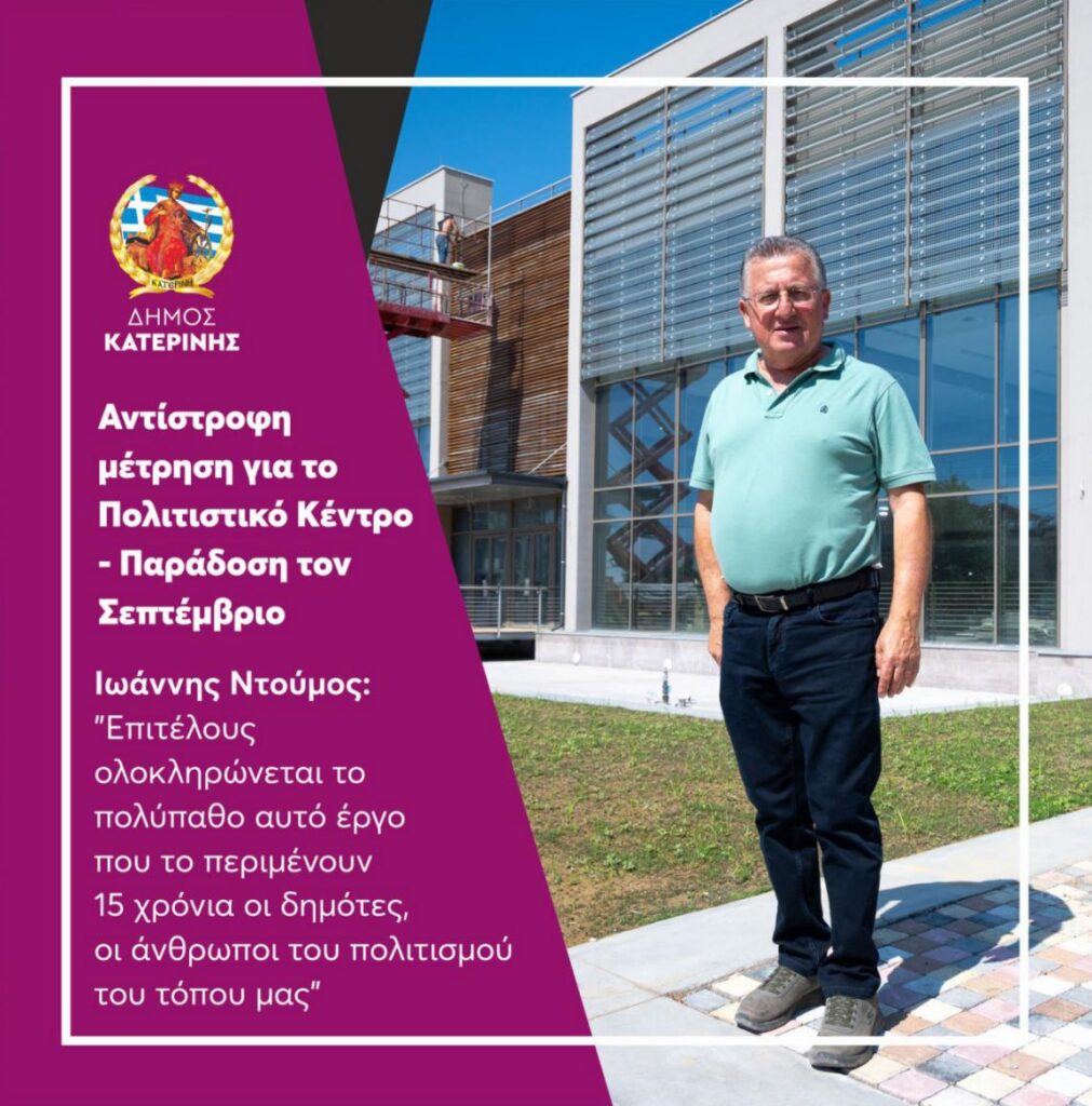 Στη διάρκεια επιτόπιας αυτοψίας που πραγματοποίησε ο Δήμαρχος Κατερίνης Ιωάννης Ντούμος, συνοδευόμενος από υπηρεσιακά στελέχη, τόνισε: «Αυτό το κτίριο – κόσμημα, αυτό το πολύπαθο έργο 15 χρόνια από την έναρξή του είναι πλέον στην τελική ευθεία. Τα στελέχη και οι υπηρεσίες του Δήμου μας σε συνεργασία με τον ανάδοχο του έργου καταβάλλουν κάθε δυνατή προσπάθεια προκειμένου να αποδοθεί, το συντομότερο στους δημότες, στους ανθρώπους του πολιτισμού του τόπου μας. Μία υποδομή Πολιτισμού και Ανάπτυξης που θεωρείται βασική συνιστώσα κάθε σύγχρονης Ευρωπαϊκής πόλης, γίνεται πραγματικότητα και στην Κατερίνη».