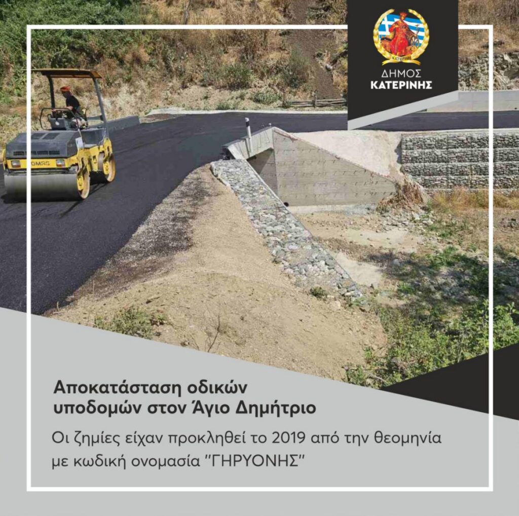 Ολοκληρώνονται από τον Δήμο Κατερίνης οι εργασίες αποκατάστασης των εκτεταμένων φθορών που είχαν υποστεί οι οδικές υποδομές της Δημοτικής Ενότητας Πέτρας, λόγω της θεομηνίας «ΓΗΡΥΟΝΗΣ» το 2019.