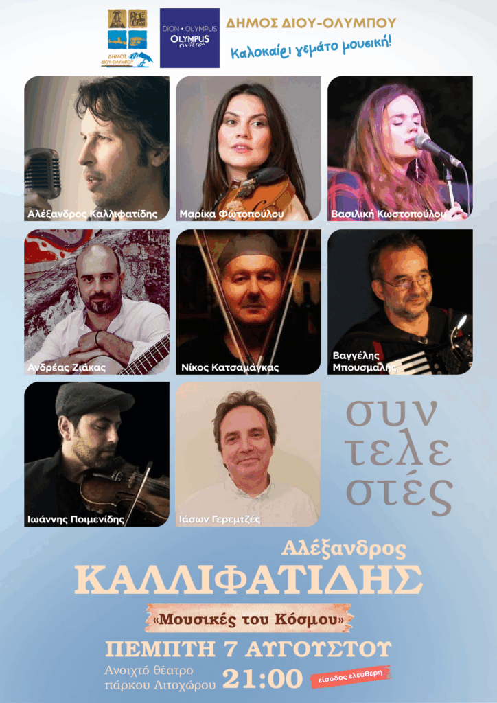 Ο Δήμος Δίου-Ολύμπου σας προσκαλεί σε ένα συναυλιακό ταξίδι γεμάτο «Μουσικές του Κόσμου», ερμηνευμένες από τον Αλέξανδρο Καλλιφατίδη την Πέμπτη 7 Αυγούστου 2025 στις 9 το βράδυ στο ανοιχτό θέατρο του δημοτικού πάρκου Λιτοχώρου.