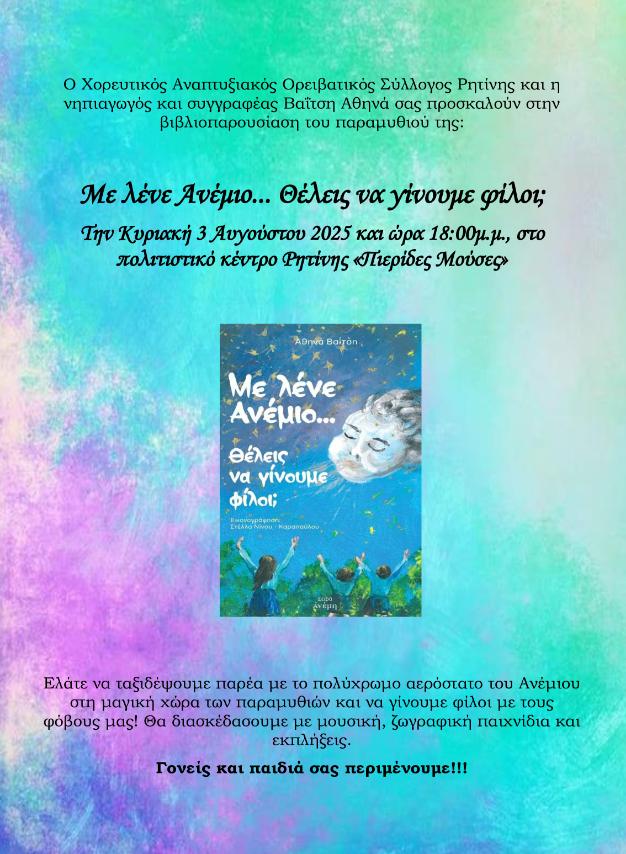 Ο Χορευτικός Αναπτυξιακός Ορειβατικός Σύλλογος Ρητίνης, με ιδιαίτερη χαρά, φιλοξενεί την νηπιαγωγό και συγγραφέα Βαΐτση Αθηνά η οποία θα παρουσιάσει το βιβλίο της.