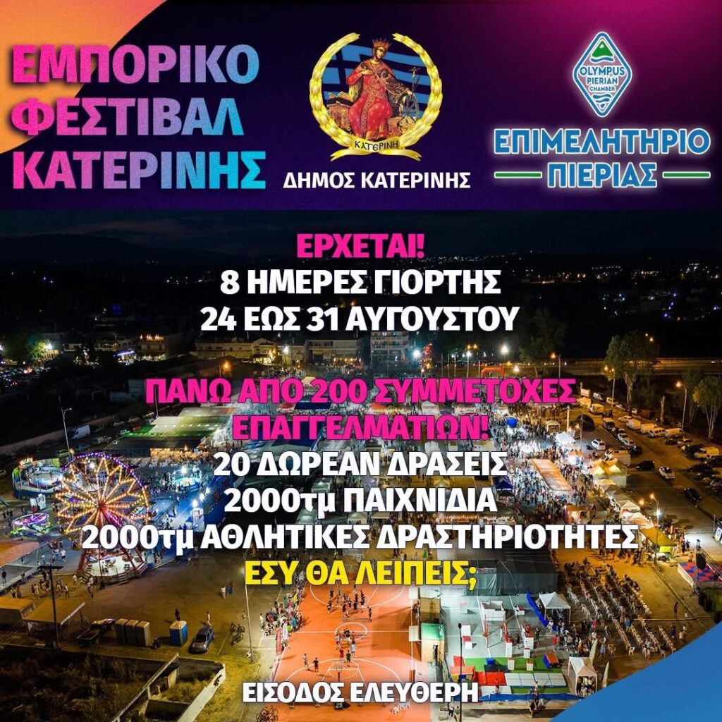 Από την πλευρά του, ο Αντιδήμαρχος Κατερίνης, κ. Ελευθέριος Παγωνίδης, διαβεβαιώνει ότι η αγαστή συνεργασία του Επιμελητηρίου, του Δήμου Κατερίνης και της Περιφερειακής Ενότητας Πιερίας αποτελεί εγγύηση για την επιτυχία του Εμπορικού Φεστιβάλ Κατερίνης. Ο κ. Παγωνίδης επισημαίνει μεταξύ άλλων ότι «ο Δήμος Κατερίνης με την καθοδήγηση του δημάρχου μας κ. Ιωάννη Ντούμου προχωρά με συνέπεια και έγκαιρο προγραμματισμό, αφενός στην αναγέννηση και στον εκσυγχρονισμό ενός παραδοσιακού θεσμού για την πόλη μας, και αφετέρου στη διασφάλιση μιας αρτιότερης διοργάνωσης με τη σύμπραξη και συνεργασία των θεσμικών φορέων της περιοχής μας».
