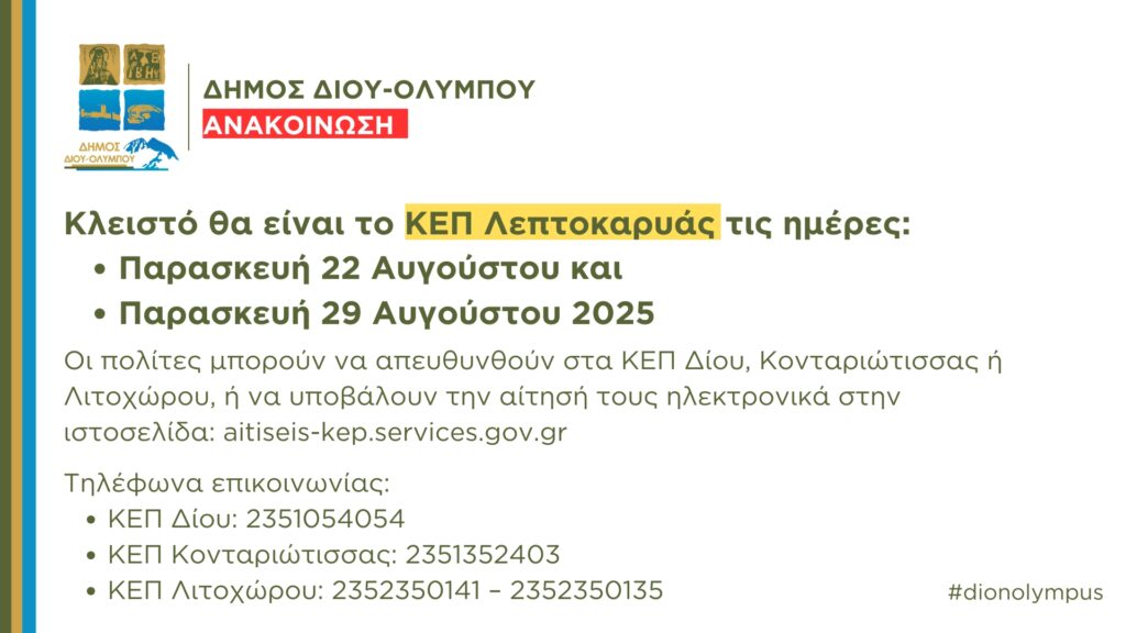 Κλειστό το ΚΕΠ Λεπτοκαρυάς την Παρασκευή 22 Αυγούστου και την Παρασκευή 29 Αυγούστου 2025 Κοινωνία 18 Αυγούστου 202518 Αυγούστου 2025Pieria Social