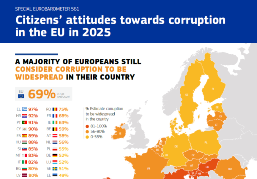 Πρόσφατα, λοιπόν, δημοσίευσε την έρευνά του για τη διαφθορά στις χώρες της ΕΕ και ρωτήθηκε επί της έρευνας αυτής και ένα μεγάλο δείγμα συμπολιτών μας περί του τι πιστεύουν σχετικά με τη διαφθορά στη δική μας χώρα. Η έρευνα έχει τίτλο ‘‘Citizens’ attitudes towards corruption in the EU in 2025’’ (https://europa.eu/eurobarometer/surveys/detail/3361) και ιδού τα εξόχως σημαίνοντα αποτελέσματά της, τα οποία, εκ των προτέρων τονίζω, μας καθιστούν ‘‘πρωταθλητές’’ της διαφθοράς στην ΕΕ: