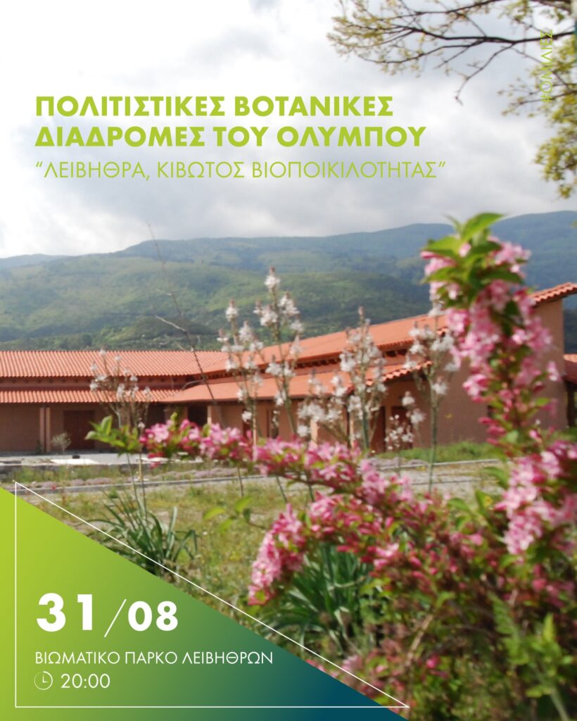 Την Κυριακή, 31 Αυγούστου 2025 στις 8:00 το βράδυ, υλοποιείται στο Βιωματικό Πάρκο Λειβήθρων στο πλαίσιο του 54ου Φεστιβάλ Ολύμπου η εσπερίδα «Πολιτιστικές Βοτανικές Διαδρομές του Ολύμπου – Λείβηθρα, Κιβωτός βιοποικιλότητας».