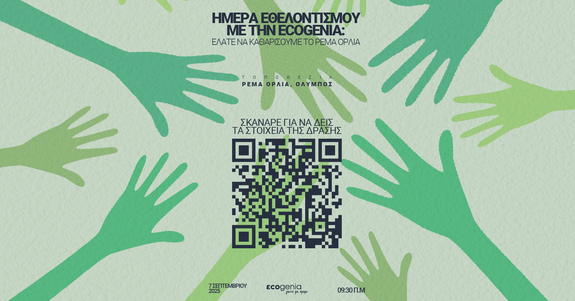 Η Ecogenia έχει την χαρά και την τιμή να σας προσκαλέσει στην Ημέρα Εθελοντισμού του προγράμματος «Όλυμπος 2025» με τίτλο “EcoMission: Καθαρίζουμε το ρέμα Ορλιά”, που θα πραγματοποιηθεί την Κυριακή, 7 Σεπτεμβρίου 2025 στις 9:30 π.μ., στο ρέμα Ορλιά, με σημείο συνάντησης το ξωκλήσι του Αγίου Κωνσταντίνου [https://maps.app.goo.gl/ovwMWVmDsQDSrTAs9].