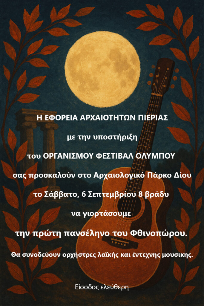 Το Σάββατο 6 Σεπτεμβρίου 2025 στις 8:00 το βράδυ στο Αρχαιολογικό Πάρκο Δίου η Εφορεία Αρχαιοτήτων Πιερίας με την υποστηρικτική συνεργασία του Οργανισμού Φεστιβάλ Ολύμπου από κοινού καθιερώνουν και θεσμοθετούν από φέτος τη βραδιά μουσικής και χρωμάτων με την ονομασία «Στο Φως του Φθινοπωρινού Φεγγαριού».