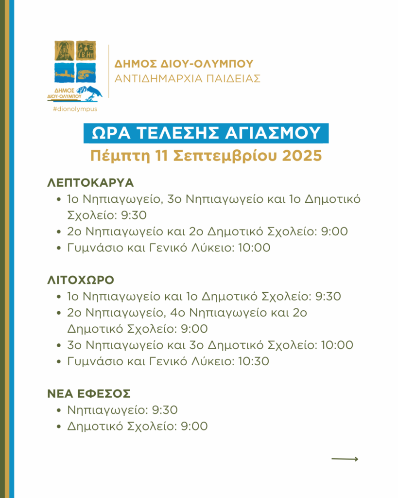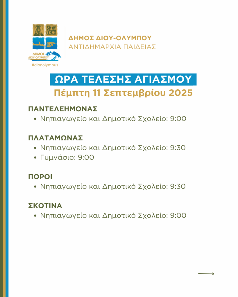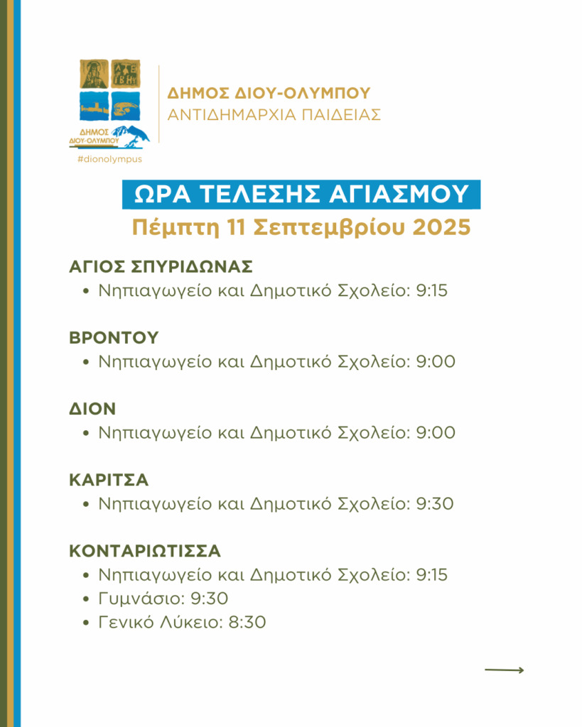 Από την Αντιδημαρχία Παιδείας του Δήμου Δίου-Ολύμπου ανακοινώνεται ότι η ώρα τέλεσης του Αγιασμού για την έναρξη της νέας σχολικής χρονιάς στους δημοτικούς παιδικούς σταθμούς, τα νηπιαγωγεία και τις σχολικές μονάδες πρωτοβάθμιας και δευτεροβάθμιας εκπαίδευσης του Δήμου, έχει ως εξής:
