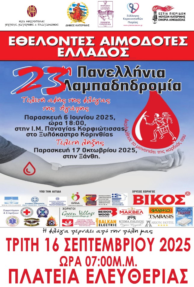 Η Εφορεία Αιμοδοσίας της Εταιρείας Πιερικών Μελετών, με την επωνυμία “Εστία Πιερίδων Μουσών Κατερίνης “, σε συνεργασία με το σύλλογο ” Παναγία Σουμελά – Ποντιακός Σύλλογος Κατερίνης“, σας προσκαλούμε την Τρίτη 16 Σεπτεμβρίου και ώρα 19:00, στην 23η Πανελλήνια Λαμπαδηδρομία των Συλλόγων Εθελοντών Αιμοδοτών Ελλάδος, (Π.Ο.Σ.Ε.Α.).