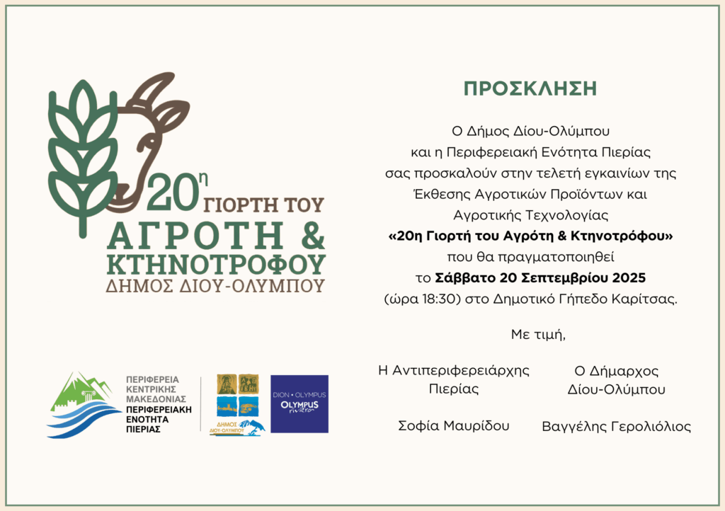 Η “20η Γιορτή του Αγρότη & Κτηνοτρόφου” είναι μια συνδιοργάνωση του Δήμου Δίου-Ολύμπου και της Περιφερειακής Ενότητας Πιερίας.