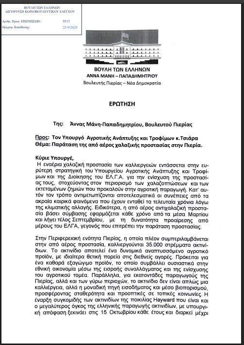 Επειδή, τα τελευταία χρόνια παρατηρούνται ακραία καιρικά φαινόμενα, όπως έντονες χαλαζοπτώσεις, ακόμη και σε χρονικές περιόδους που στο παρελθόν θεωρούνταν ήπιες, όπως το τέλος του φθινοπώρου. Η εξέλιξη αυτή προκαλεί σοβαρές ζημιές στην αγροτική παραγωγή, με άμεσες επιπτώσεις στο εισόδημα των παραγωγών. Πρόκειται για μια κατάσταση που πρέπει να αντιμετωπιστεί σε επίπεδο πρόληψης, με την ενίσχυση των μηχανισμών προστασίας και την υιοθέτηση σύγχρονων μέτρων αντιχαλαζικής θωράκισης. Ήδη, πολλοί παραγωγοί έχουν εκφράσει την παραπάνω άποψη, ζητώντας άμεσες λύσεις, καθώς οι ζημιές που καταγράφονται απειλούν τη βιωσιμότητα των καλλιεργειών τους. Για το ίδιο θέμα η Οργάνωση Παραγωγών Ζευς Ακτινίδια Α.Ε. που δραστηριοποιείται στην περιοχή μας έστειλε επιστολή στις 23-9-2025 προς τον ΕΛ.Γ.Α. με κοινοποίηση και στο Υπουργείο την οποία και σας επισυνάπτω.
