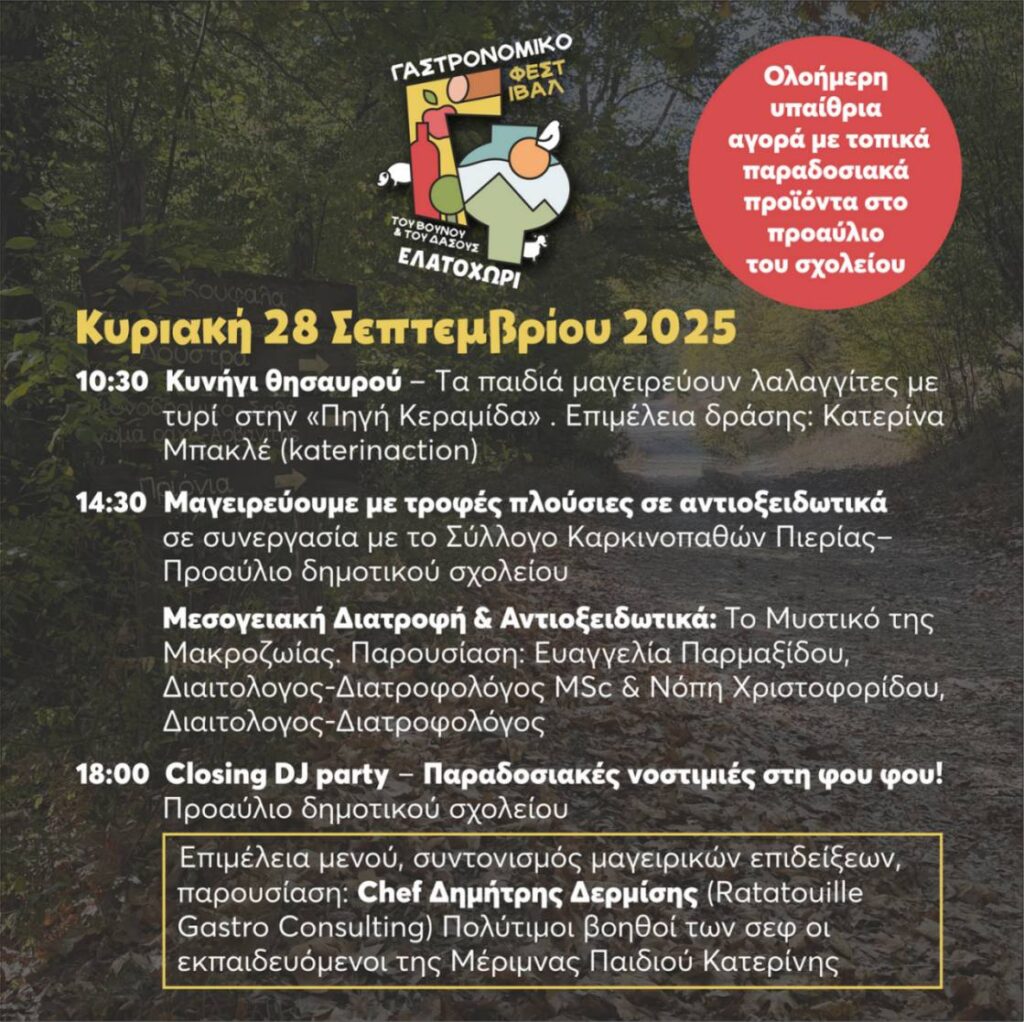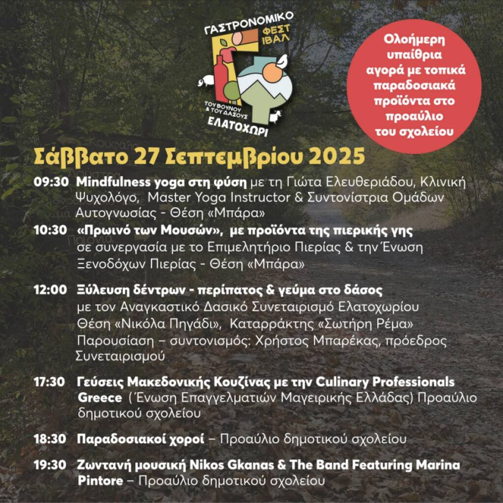 Δήμος Κατερίνης: Το «Γαστρονομικό Φεστιβάλ του Βουνού & του Δάσους» αύριο Σάββατο 27 & την Κυριακή 28 Σεπτεμβρίου στο Ελατοχώρι Γεύσεις 26 Σεπτεμβρίου 202526 Σεπτεμβρίου 2025Pieria Social