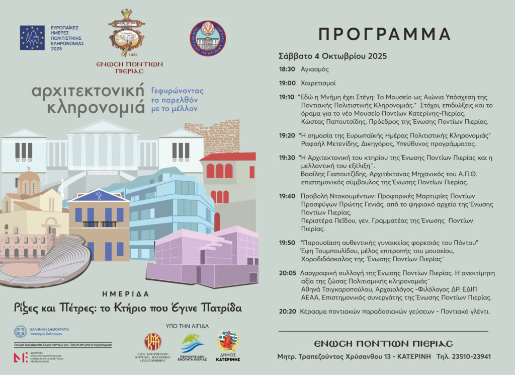 Η Ένωση Ποντίων Πιερίας με ιδιαίτερη τιμή και χαρά σας προσκαλεί στην ημερίδα ¨Ρίζες και Πέτρες: το Κτήριο που έγινε Πατρίδα¨ η οποία θα πραγματοποιηθεί το Σάββατο 4 Οκτωβρίου 2025 και ώρα 18:30, στο πλαίσιο των Ευρωπαϊκών Ημερών Πολιτιστικής Κληρονομιάς, στο Πνευματικό-Πολιτιστικό Κέντρο του συλλόγου.