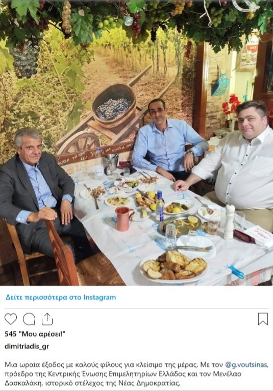 «Μια ωραία έξοδος με καλούς φίλους για κλείσιμο της μέρας. Με τον Γιάννη Βουτσινά, πρόεδρο της Κεντρικής Ένωσης Επιμελητηρίων Ελλάδος, και τον Μενέλαο Δασκαλάκη, ιστορικό στέλεχος της Νέας Δημοκρατίας».