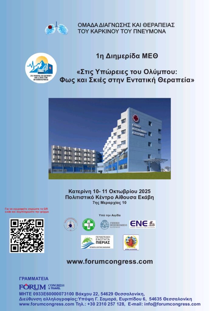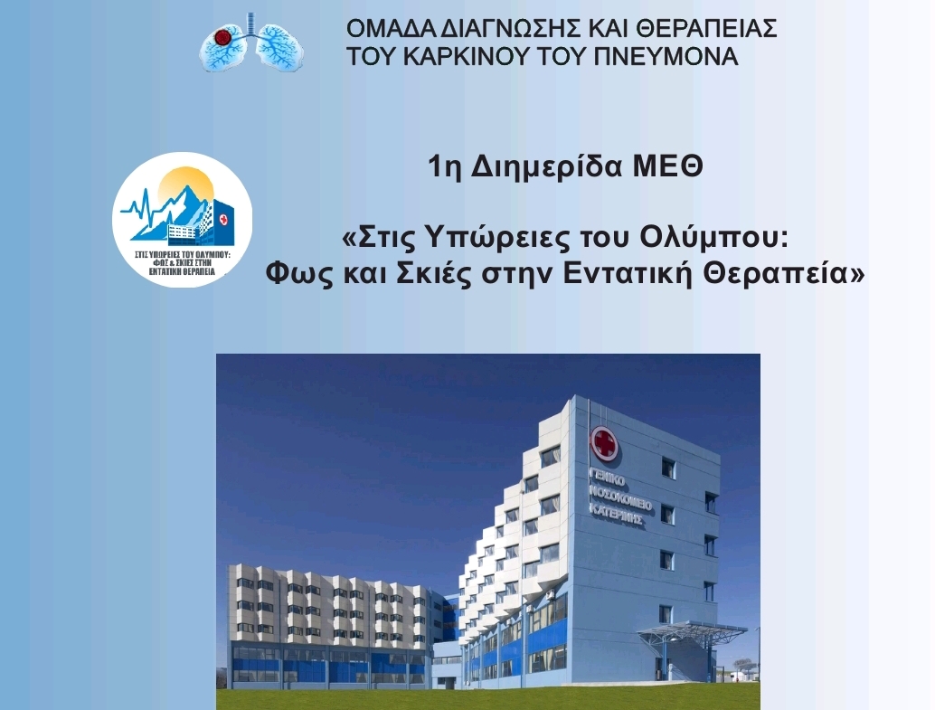 1η Διημερίδα Μ.Ε.Θ. σε συνεργασία με την Ομάδα Διάγνωσης και Θεραπείας του Καρκίνου του Πνεύμονα: “Στις Υπώρειες του Ολύμπου: Φως και Σκιές στην εντατική θεραπεία”/10 & 11 Οκτωβρίου στο Πνευματικό Κέντρο Δ. Κατερίνης (συνεδριακή αίθουσα – ισόγειο).