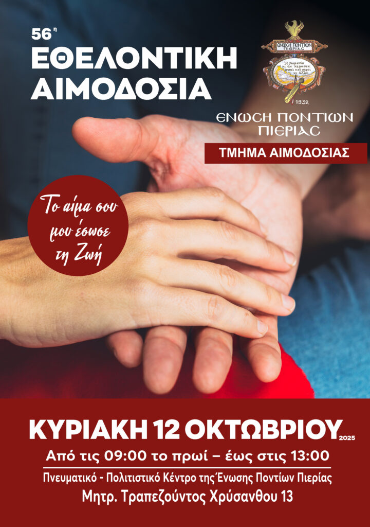 𝚮 𝚬𝚴𝛀𝚺𝚮 𝚷𝚶𝚴𝚻𝚰𝛀𝚴 𝚷𝚰𝚬𝚸𝚰𝚨𝚺 προσκαλεί τα μέλη και τους φίλους του συλλόγου να συμμετάσχουν στην 𝟱𝟲𝝶 Εθελοντική Αιμοδοσία που θα πραγματοποιηθεί την Κυριακή 12 Οκτωβρίου 2025 από τις 9 το πρωί έως στις 1 το μεσημέρι, στο Πνευματικό-Πολιτιστικό κέντρο του Συλλόγου, (Μητροπολίτου Τραπεζούντος Χρύσανθου 13).