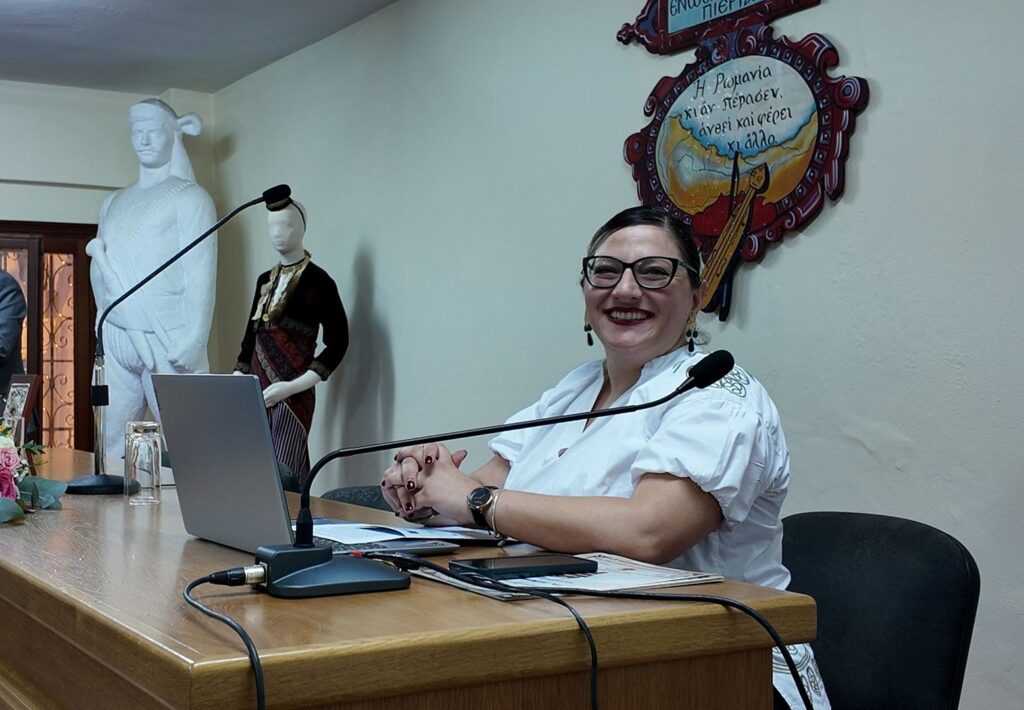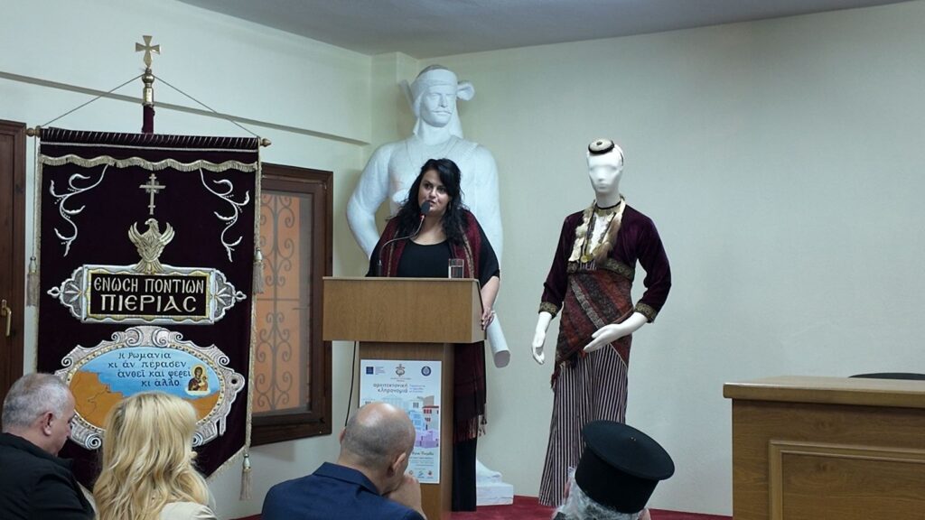 • Τέλος, η Δρ. Αθηνά Τσιγκαροπούλου, Αρχαιολόγος -Φιλόλογος και Επιστημονικός συνεργάτης της Ένωσης Ποντίων Πιερίας, έκλεισε τις εισηγήσεις μιλώντας για τη Λαογραφική συλλογή και την ανεκτίμητη αξία της ζώσας Πολιτισμικής κληρονομιάς, ενώ παρουσίασε εικόνες από τα 600 και πλέον κειμήλια της Ένωσης.