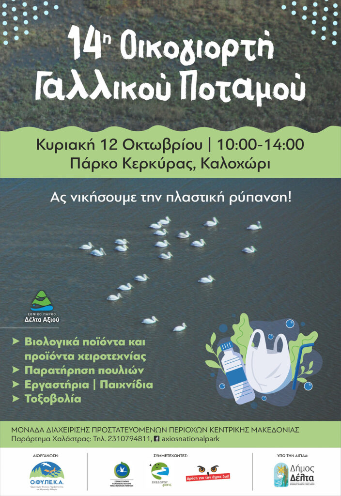 Με θέμα «Ας νικήσουμε την πλαστική ρύπανση», θα πραγματοποιηθεί φέτος για 14η χρονιά στο Καλοχώρι του Δήμου Δέλτα η Οικογιορτή Γαλλικού Ποταμού, την Κυριακή 12 Οκτωβρίου 2025. Η εκδήλωση θα πραγματοποιηθεί από τις 10 το πρωί έως τις 2 μετά το μεσημέρι, στο Πάρκο Κερκύρας, μπροστά στη Λιμνοθάλασσα Καλοχωρίου και θα περιλαμβάνει ένα πλούσιο πρόγραμμα με παιχνίδια, εργαστήρια, facepainting, αλλά και έκθεση βιολογικών προϊόντων και προϊόντων χειροτεχνίας.