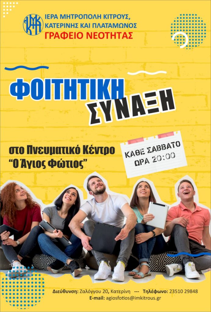 Φοιτητική σύναξη από αύριο Σάββατο 11 Οκτωβρίου και κάθε Σάββατο και ώρα : 8μ.μ. στο Πνευματικό Κέντρο ”Ο Άγιος Φώτιος” της Ιεράς μας Μητροπόλεως Κοινωνία 10 Οκτωβρίου 202510 Οκτωβρίου 2025Pieria Social