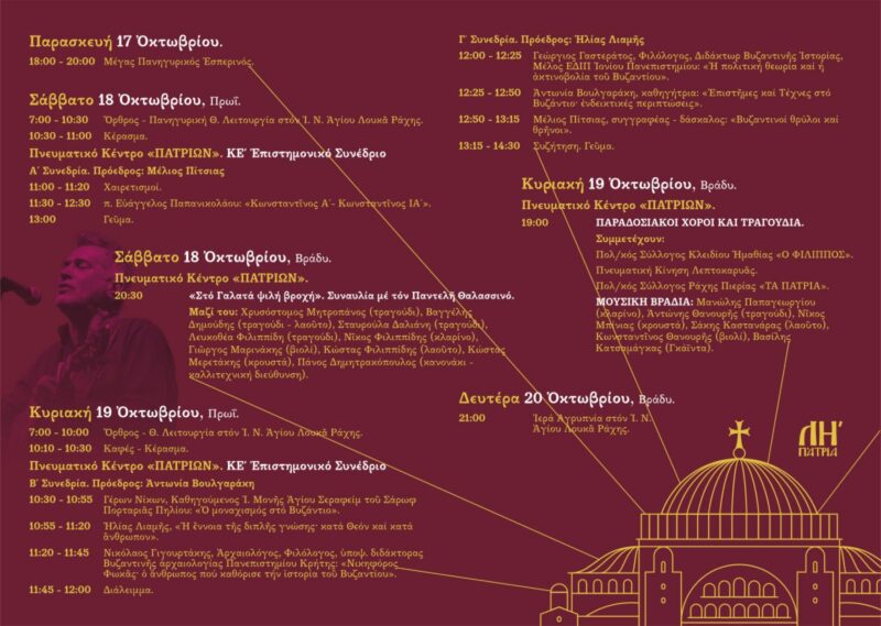 Ο Πολιτιστικός Σύλλογος Ράχης Πιερίας «ΤΑ ΠΑΤΡΙΑ» διοργανώνει τις εκδηλώσεις των ΛΗ΄ Πατρίων, αφιερωμένες φέτος στο Βυζάντιο, με τίτλο «Λαμπρές Βυζαντίου Ακτίνες – Πρόσωπα, Αρχές, Αξίες της Χιλιετούς Αυτοκρατορίας», από 17 έως 21 Οκτωβρίου 2025 στη Ράχη Πιερίας.
