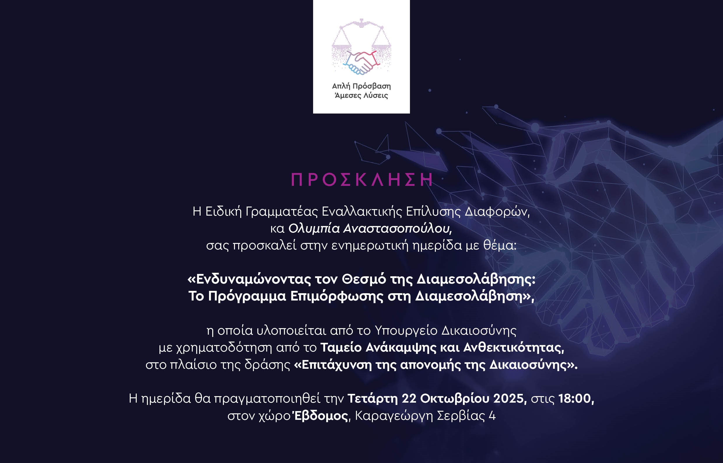 Η ημερίδα πραγματοποιείται στο πλαίσιο του έργου «Αναβάθμιση Πληροφοριακών Συστημάτων Πιστοποιημένων Κέντρων Διαμεσολάβησης» της δράσης «Επιτάχυνση της απονομής της Δικαιοσύνης», με χρηματοδότηση από το Ταμείο Ανάκαμψης και Ανθεκτικότητας.