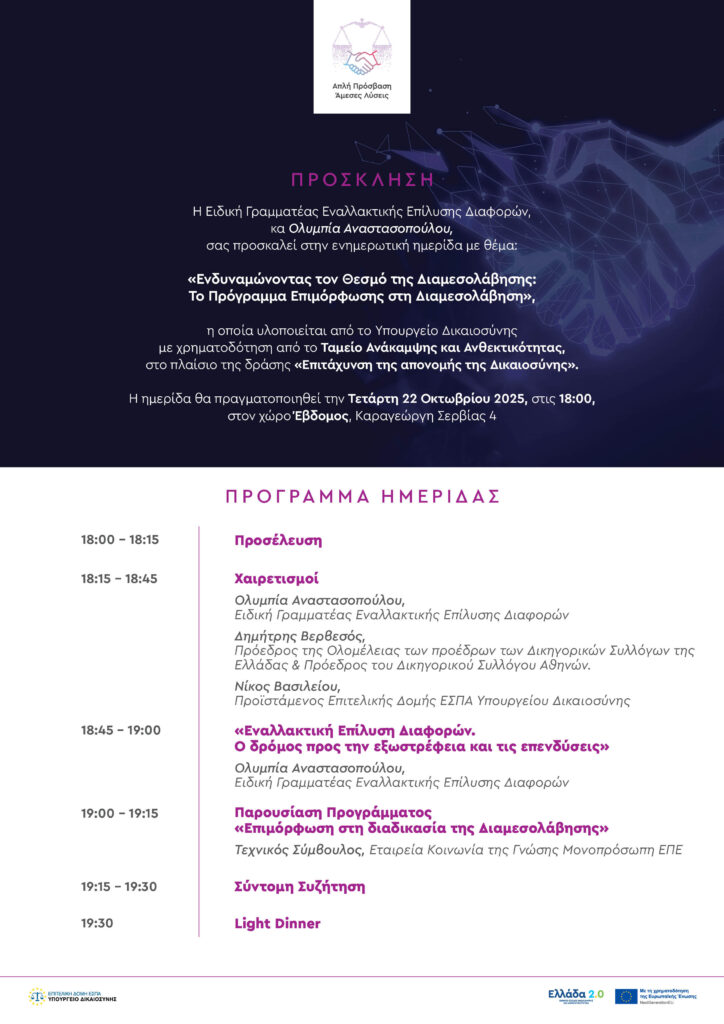 Το Υπουργείο Δικαιοσύνης διοργανώνει ενημερωτική ημερίδα με θέμα: «Ενδυναμώνοντας τον Θεσμό της Διαμεσολάβησης», η οποία θα πραγματοποιηθεί την Τετάρτη 22 Οκτωβρίου 2025, στις 18:00,
