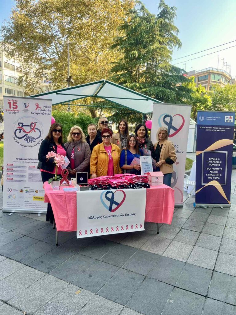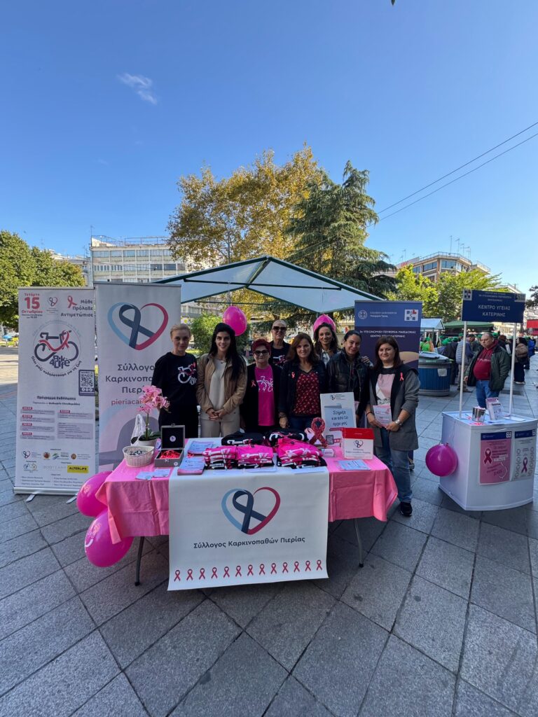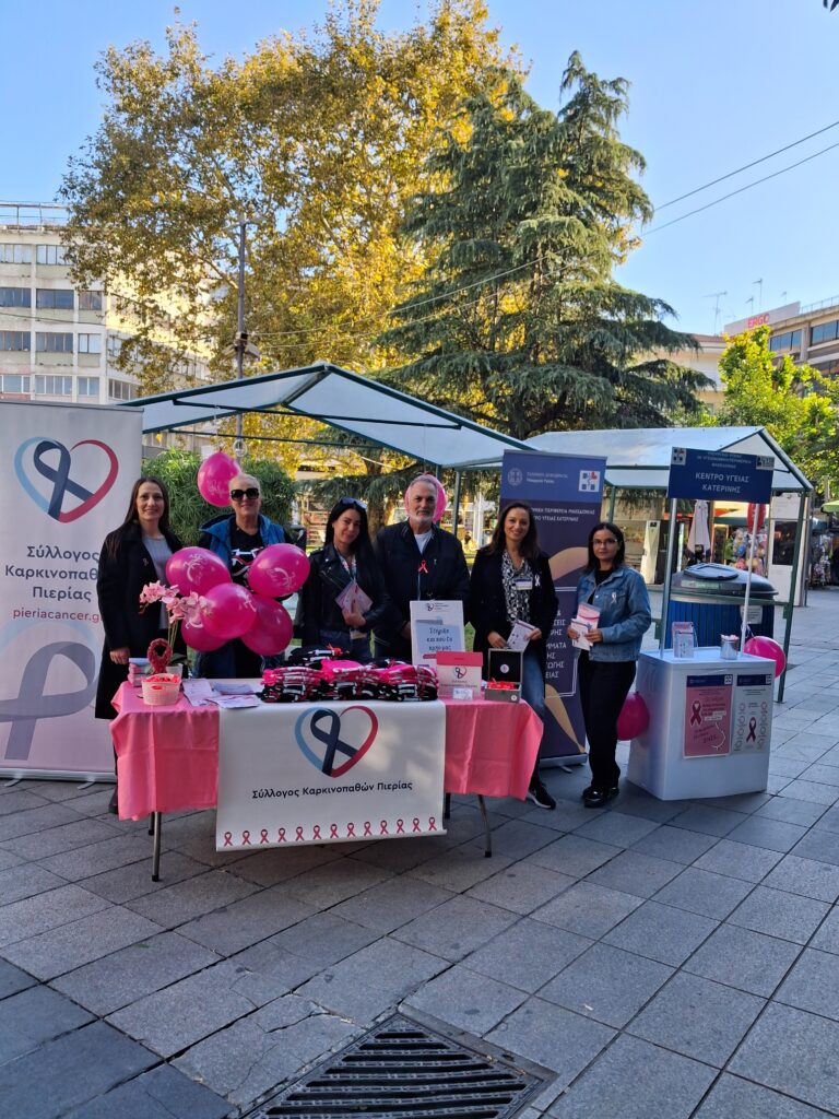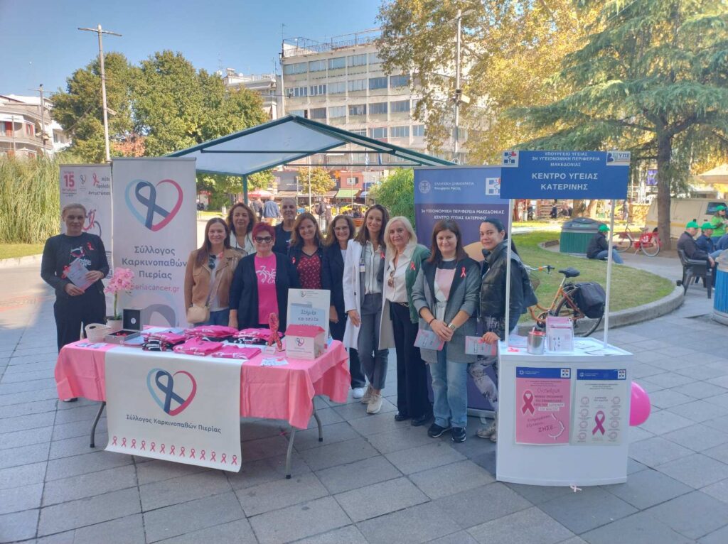 Στο πλαίσιο του Οκτώβρη, μήνα πρόληψης, ενημέρωσης και ευαισθητοποίησης για τον καρκίνο του μαστού, ο Σύλλογος Καρκινοπαθών Πιερίας διοργάνωσε μία εκτεταμένη εκστρατεία ενημέρωσης και ευαισθητοποίησης, σε συνεργασία με την Ιερά Μητρόπολη Κατερίνης, Κίτρους και Πλαταμώνος, την Περιφερειακή Ενότητα Πιερίας και τον Δήμο Κατερίνης και με την υποστήριξη του Κέντρου Υγείας Κατερίνης, της 4ης και 12ης ΤΟΜΥ.