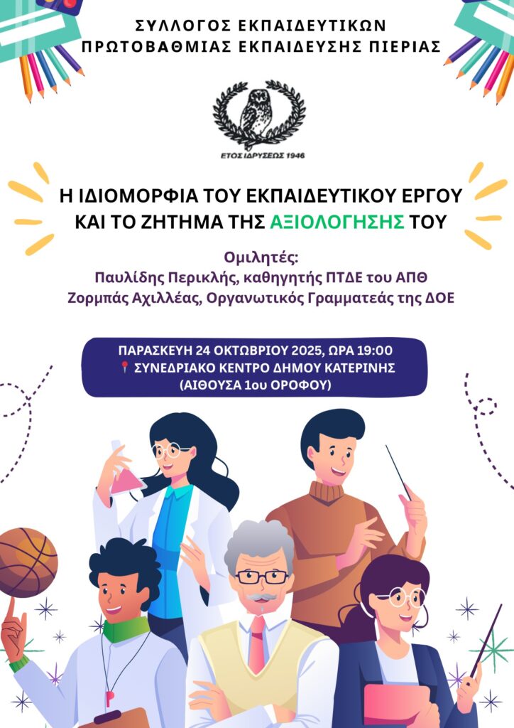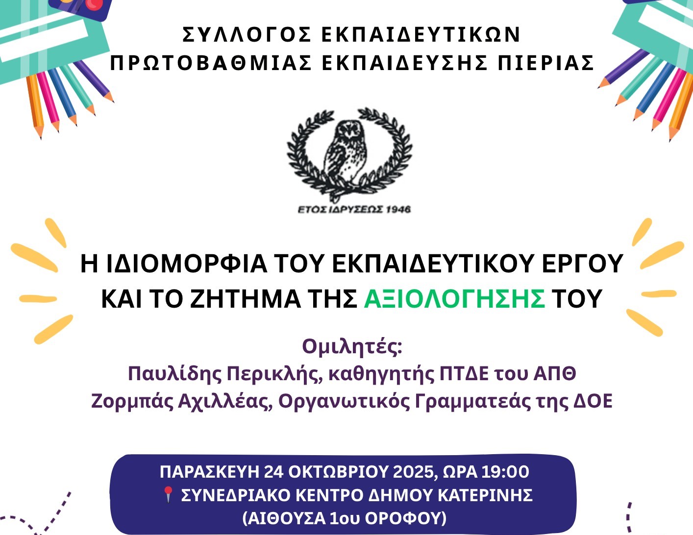 Με μεγάλη χαρά σας προσκαλούμε την Παρασκευή 24 Οκτωβρίου 2025 και ώρα 19:00 στο Συνεδριακό Κέντρο του Δήμου Κατερίνης να παρευρεθείτε σε εκδήλωση του συλλόγου μας με κεντρικό ομιλητή τον Παυλίδη Περικλή καθηγητή ΠΤΔΕ του ΑΠΘ με θέμα: «Η ιδιομορφία του εκπαιδευτικού έργου και το ζήτημα της αξιολόγησής του».