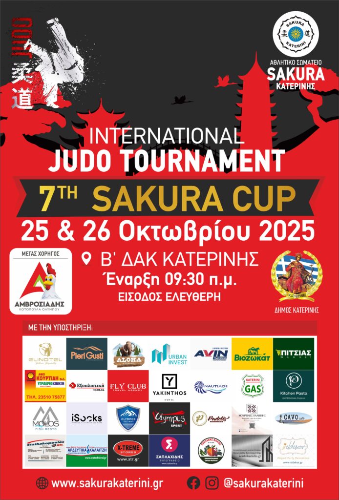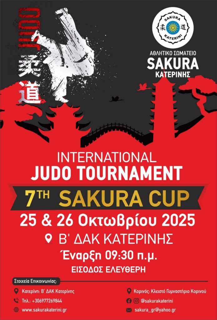 Το Αθλητικό Σωματείο SAKURA Κατερίνης επιστρέφει δυναμικά, διοργανώνοντας μετά από οκτώ χρόνια το 7th SAKURA CUP – Διεθνές Τουρνουά & Προπονητικό Καμπ Τζούντο, μία κορυφαία αθλητική εκδήλωση που θα φιλοξενήσει αθλητές και προπονητές από την Ελλάδα και το εξωτερικό.