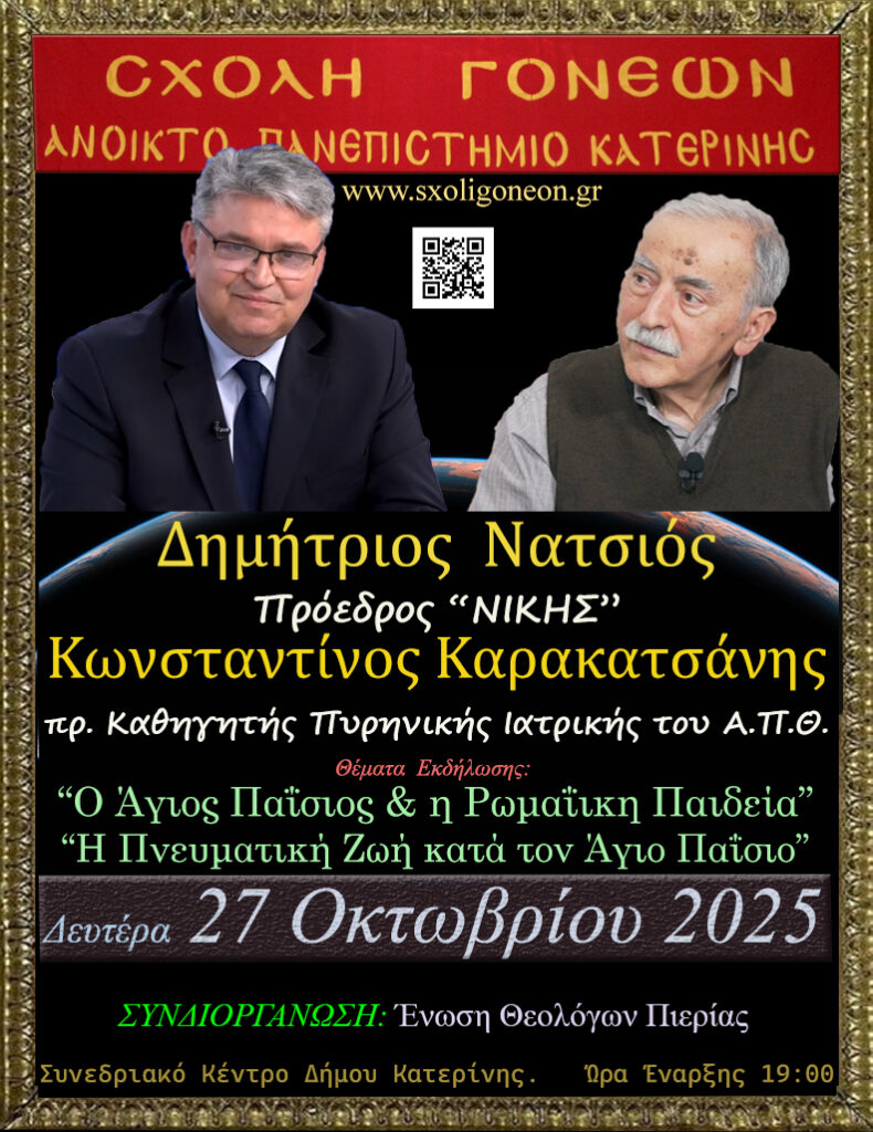 Ο Πρόεδρος της “ΝΙΚΗΣ” Δημήτριος Νατσιός & & ο πρ. καθηγητής Πυρηνικής Ιατρικής Κωνσταντίνος Καρακατσάνης θα είναι οι επίσημοι ομιλητές και καλεσμένοι της Σχολής Γονέων – Ανοικτό Πανεπιστήμιο Κατερίνης την Δευτέρα 27-10-2025. Το θέμα της ομιλίας του κ. Νατσιού είναι: “Ο Άγιος Παΐσιος & η Ρωμαΐικη Παιδεία” και του κ. Καρακατσάνη: “Η Πνευματική Ζωή κατά τον Άγιο Παΐσιο”