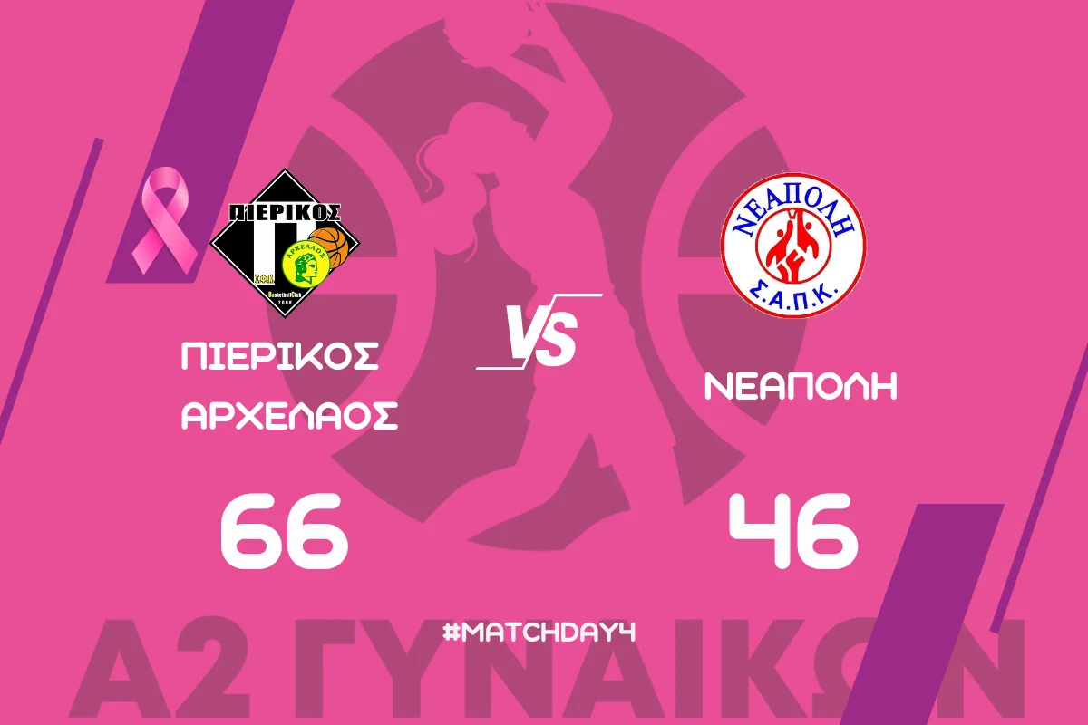 Ο Πιερικός Αρχέλαος επικράτησε με 66-46 της Νεάπολης στο Κλειστό Γυμναστήριο Σιδηροδρομικού Σταθμού Κατερίνης σε αγώνα για την 4η αγωνιστική του 2ου ομίλου της Α2 Εθνικής Κατηγορίας Γυναικών.