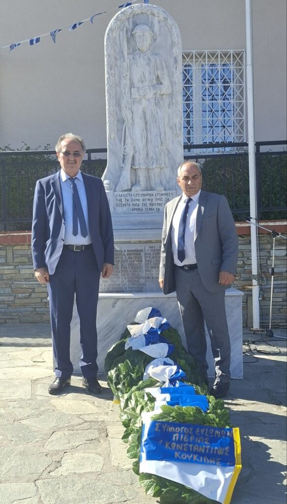 Αντίστοιχα, ο Γραμματέας της Νομαρχιακής Κοινότητας Πιερίας κ. Ευστράτιος Ξυγωνάκης κατέθεσε στεφάνι στο Αιγίνιο, ενώ ο πολιτευτής ΝΙΚΗΣ κ. Νικόλαος Τσερτικίδης εκπροσώπησε τη ΝΙΚΗ στην κοινότητα Βροντούς, αποδίδοντας τιμή στους ήρωες που αγωνίστηκαν για την ελευθερία της πατρίδας μας.