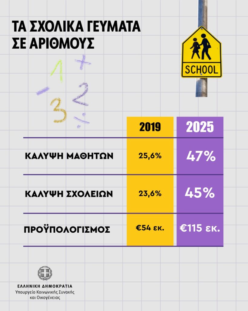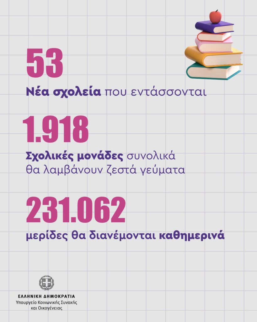 Το Υπουργείο Κοινωνικής Συνοχής και Οικογένειας με τον εποπτευόμενο Οργανισμό Προνοιακών Επιδομάτων και Κοινωνικής Αλληλεγγύης (ΟΠΕΚΑ), ενημερώνουν ότι σήμερα Τετάρτη 29 Οκτωβρίου 2025, ξεκινά η υλοποίηση του Προγράμματος των Σχολικών Γευμάτων στις σχολικές μονάδες που περιλαμβάνονται στην αριθμ.14457/08.10.2025 Κοινή Υπουργική Απόφαση (ΦΕΚ Β΄ 5381).