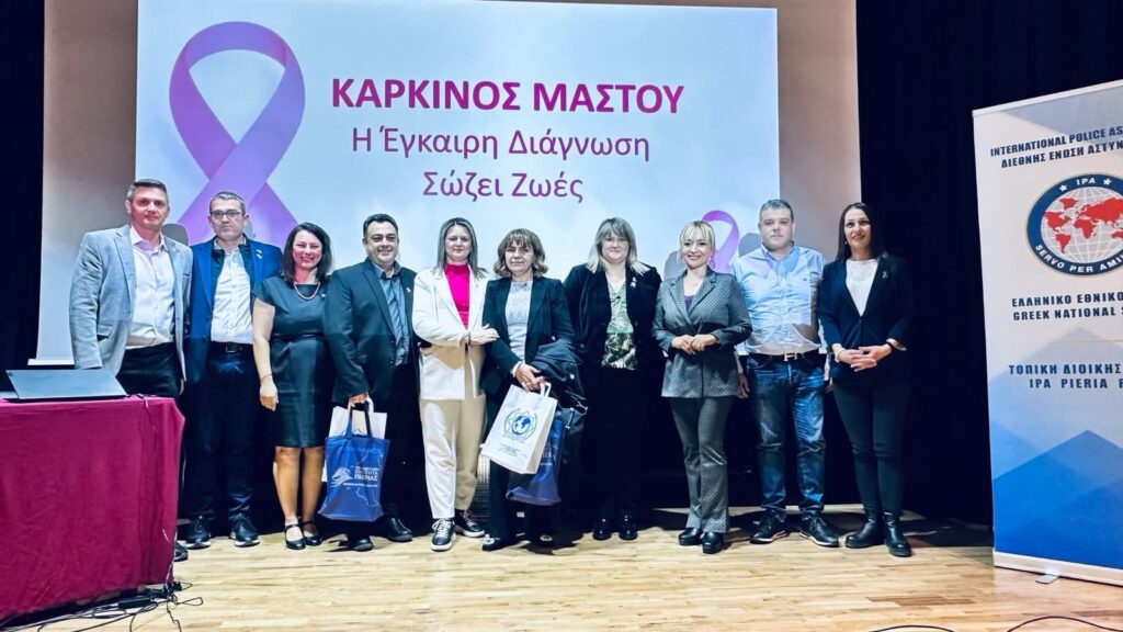 Με μεγάλη επιτυχία πραγματοποιήθηκε η ενημερωτική ημερίδα για την πρόληψη κατά του καρκίνου του μαστού με τίτλο «Μη Φοβάσαι, Ενημερώσου, Ρώτα», την Τετάρτη 29 Οκτωβρίου 2025, στο Πνευματικό Κέντρο Αγ. Φωτίου Κατερίνης, η οποία διοργανώθηκε από την Τοπική Διοίκηση Πιερίας της Διεθνούς Ένωσης Αστυνομικών (I.P.A.) σε συνεργασία με την Περιφερειακή Ενότητα Πιερίας και τον Σύλλογο Καρκινοπαθών Πιερίας υπό την Αιγίδα της Ιεράς Μητροπόλεως Κίτρους, Κατερίνης και Πλαταμώνος και του Ιατρικού Συλλόγου Πιερίας.