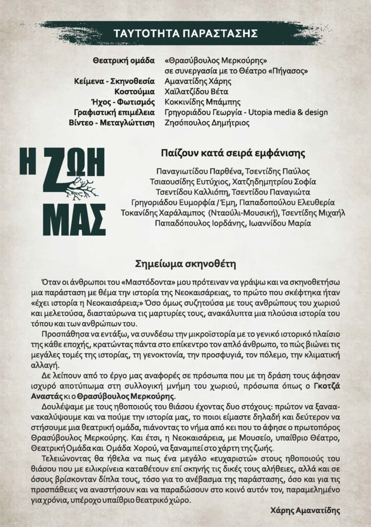 Η παράσταση «Η ΖΩΗ ΜΑΣ» είναι ένα βαθιά συγκινητικό έργο που συνδυάζει στοιχεία κοινωνικού ρεαλισμού, δράματος και σύγχρονης κωμωδίας. Διαδραματίζεται σε ένα μικρό χωριό της Πιερίας, αντλώντας έμπνευση από τις πραγματικές ρίζες της Νεοκαισάρειας.