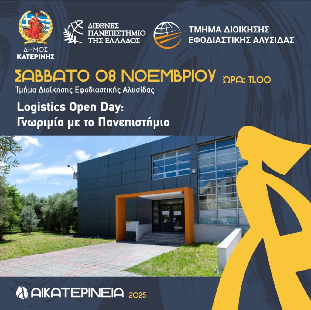 Ανοιχτή επίσκεψη στο Τμήμα Διοίκησης Εφοδιαστικής Αλυσίδας του Διεθνούς Πανεπιστημίου της Ελλάδος. Οι επισκέπτες θα ξεναγηθούν σε σύγχρονα εργαστήρια, στις αίθουσες διδασκαλίας και στις εκπαιδευτικές αποθήκες, θα δουν ρομποτικά συστήματα αποθήκης και αυτόνομα οχήματα σε δράση και θα γνωρίσουν το Μουσείο LOGIC. Ευκαιρία για διάλογο με φοιτητές και προσωπικό και για ανακαλύψεις στην εφοδιαστική επιστήμη και πρακτική.