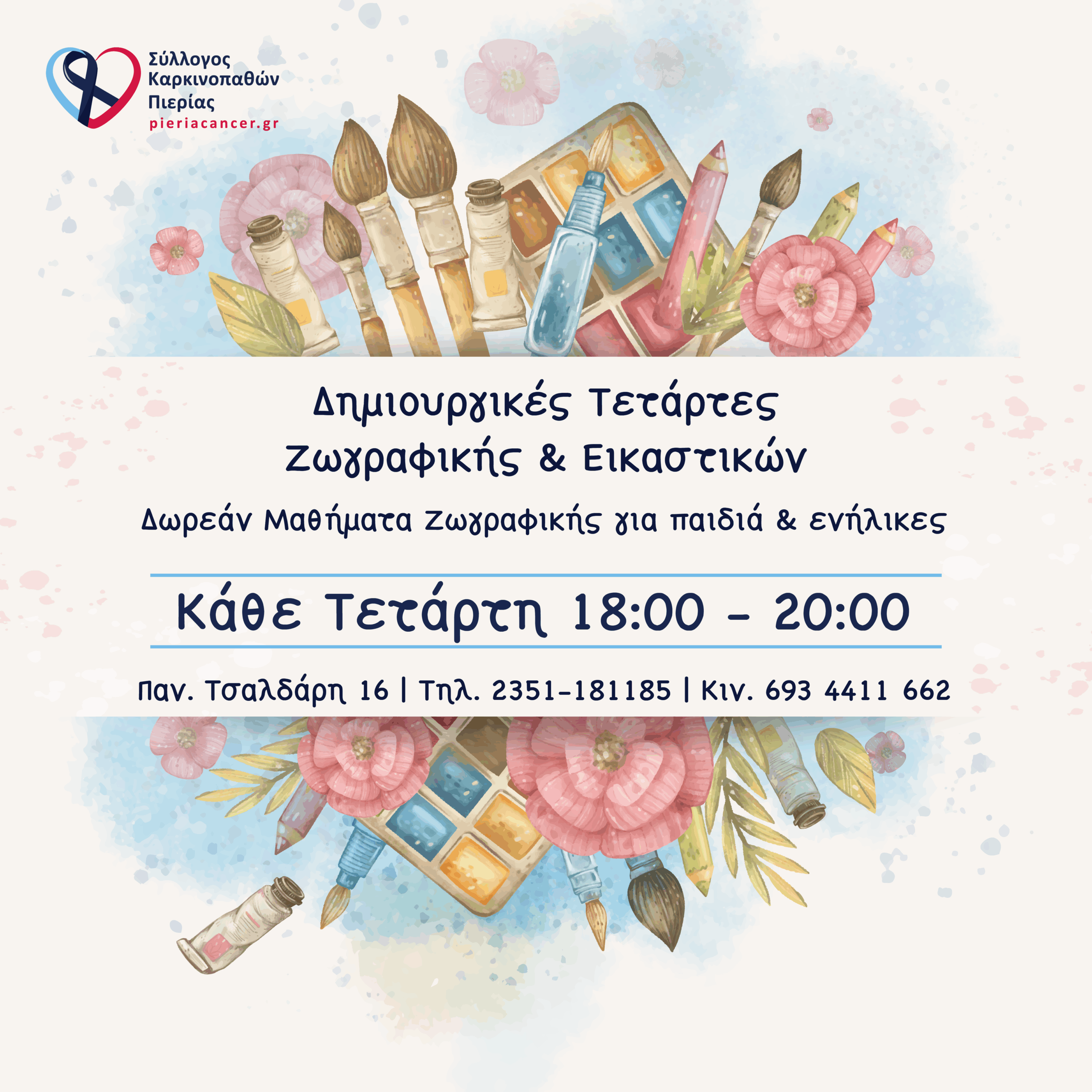 Ο Σύλλογος Καρκινοπαθών Πιερίας ανακοινώνει με χαρά την επανεκκίνηση του επιτυχημένου κοινωνικού προγράμματος «Δημιουργικές Τετάρτες» και συγκεκριμένα του Τμήματος Ζωγραφικής & Εικαστικών, για δεύτερη συνεχή χρονιά.