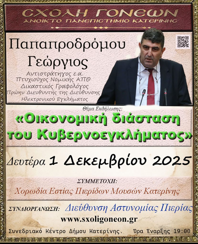 Η επόμενη εκδήλωση θα πραγματοποιηθεί την Δευτέρα 1-12-2025 με επίσημο ομιλητή και καλεσμένο τον Αντιστράτηγο ε.α. & πρώην Διευθυντή Δίωξης Ηλεκτρονικού Εγκλήματος κ. Γεώργιο Παπαπροδρόμου και θέμα: «Οικονομική διάσταση του Κυβερνοεγκλήματος»