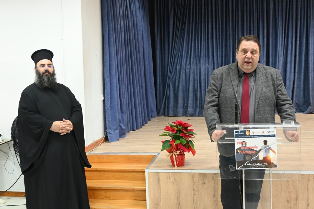 Η συνεργασία των δύο θεσμών, της Εκπαίδευσης και της Εκκλησίας, δηλώνει έμπρακτα την κοινή μας πίστη στη δύναμη της παιδείας, της παράδοσης και του πολιτισμού να ενώνουν ανθρώπους, να εμπνέουν νέες γενιές και να καλλιεργούν αξίες που θεμελιώνουν μια κοινωνία αλληλεγγύης, δημιουργίας και προόδου. Θερμές ευχαριστίες απευθύνουμε στη Ιερά μας Μητρόπολη για την άριστη συνεργασία και τη στήριξή της, καθώς και σε όλους όσοι συνέβαλαν στη διοργάνωση και πραγματοποίηση της σημερινής εκδήλωσης. Η παρουσία όλων σας δίνει δύναμη και νόημα στις κοινές μας προσπάθειες».