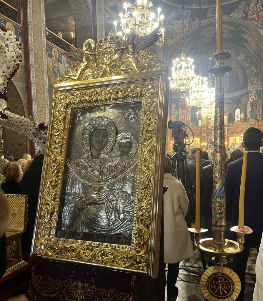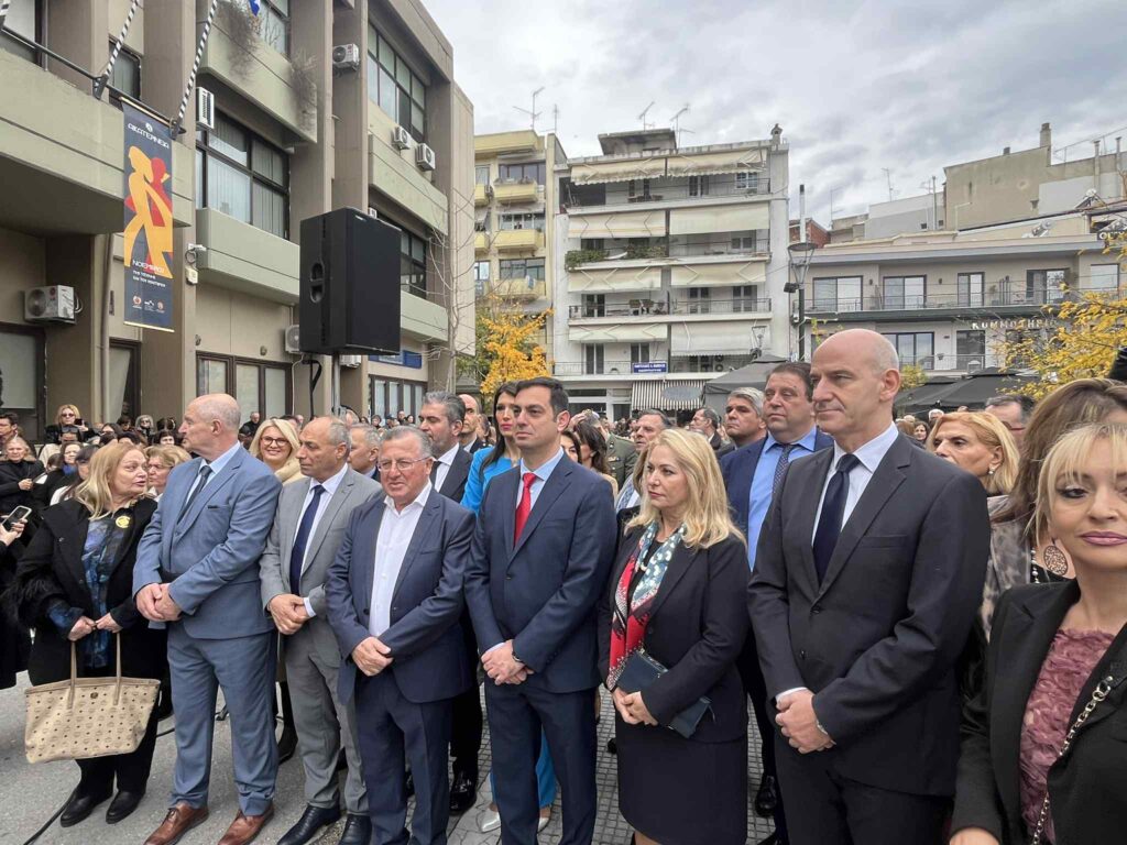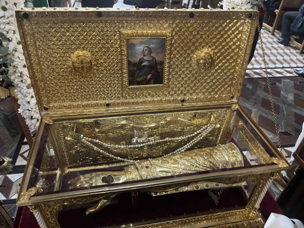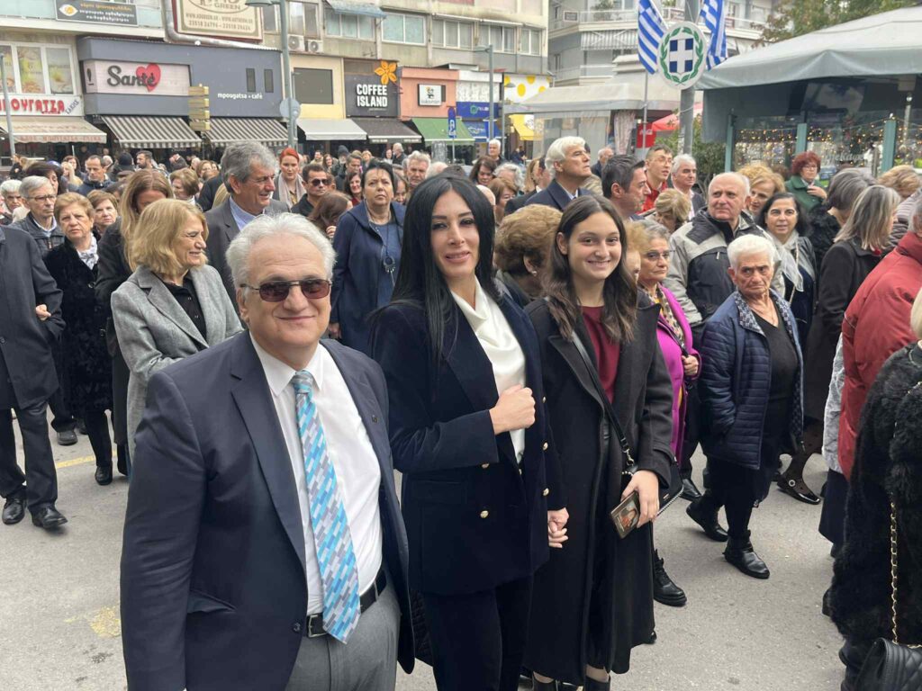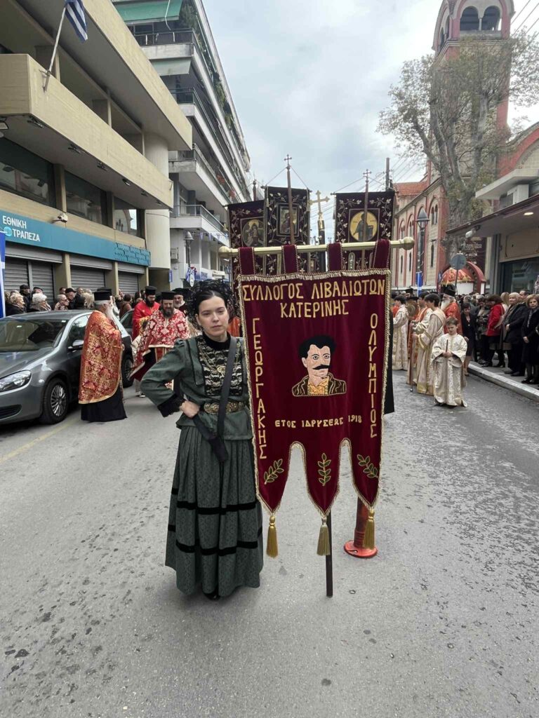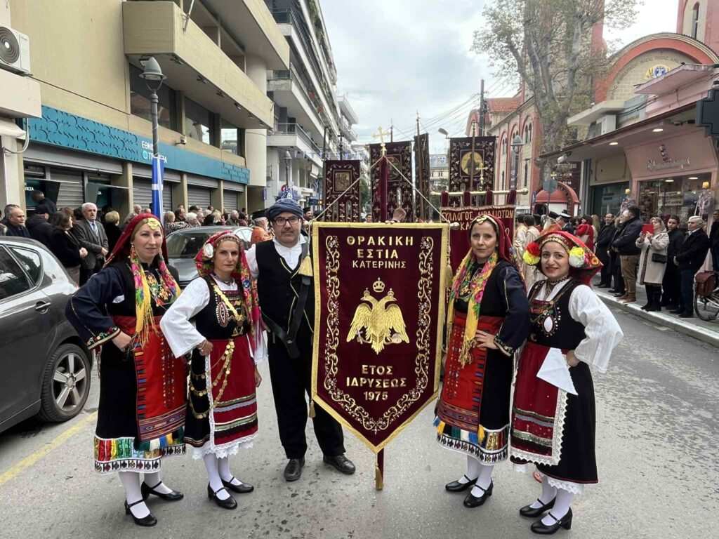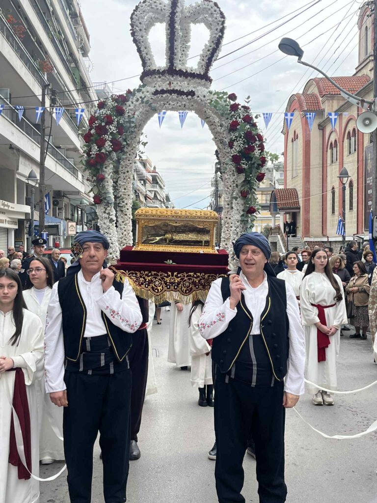 Ακολούθησε στο κέντρο της πόλης, στο Δημαρχείο, η Λιτάνευση της Ιεράς Εικόνας της Παναγίας της Πέτρας (προερχομένης από την ομώνυμη Ιερά Μονή Ολύμπου), του Ιερού Λειψάνου και της Ιεράς Εικόνας της Αγίας Αικατερίνης, υπό τους ήχους της Φιλαρμονικής του Δημοτικού Ωδείου Κατερίνης.