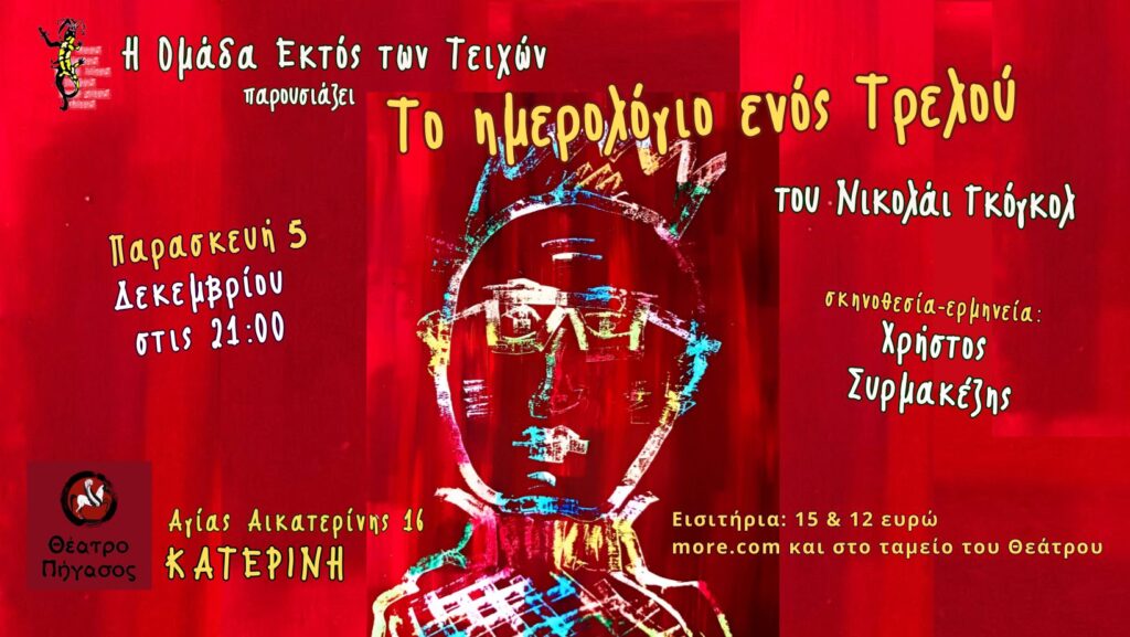 Η Ομάδα Εκτός των Τειχών παρουσιάζει το μοναδικής ψυχολογικής ακριβείας έργο του Νικολάι Γκόγκολ ‘’Το ημερολόγιο ενός τρελλού’’. Το΄΄Ημερολόγιο΄΄, γραμμένο το 1835, αποτελεί ένα σχεδόν αυτοβιογραφικό κείμενο του ίδιου του συγγραφέα και ταυτόχρονα απόπειρα κατανόησης της ψυχικής ασθένειας.