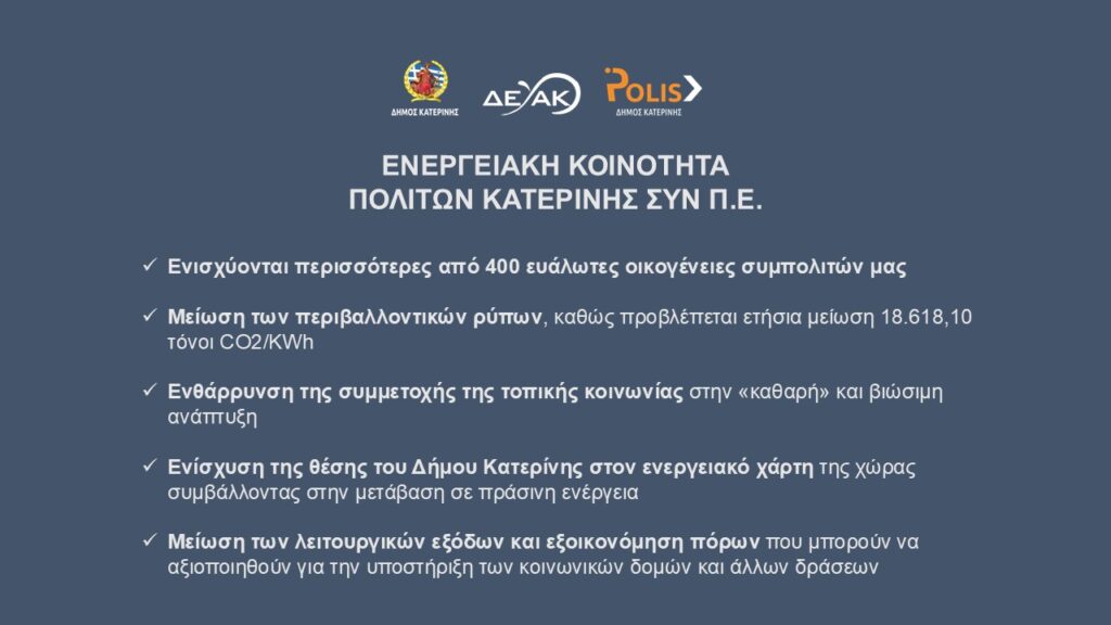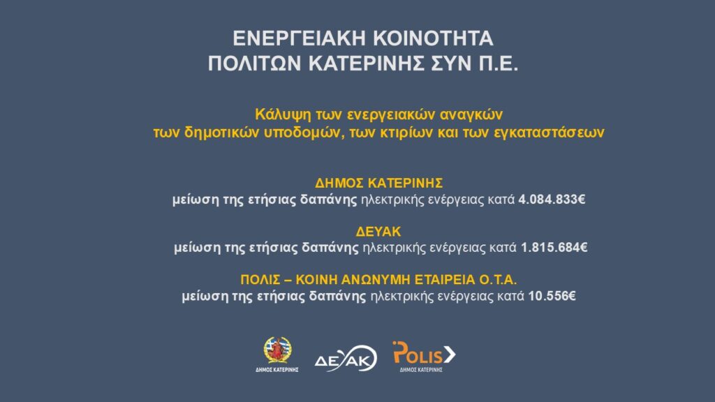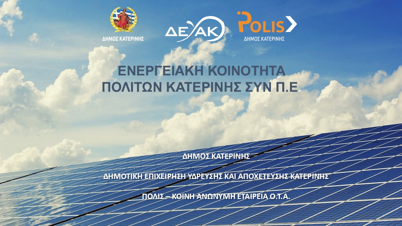 - Συστήνεται Ενεργειακή Κοινότητα με τη συμμετοχή του Δήμου Κατερίνης, της ΔΕΥΑΚ και των Δημοτικών Πάρκινγκ «ΠΟΛΙΣ»