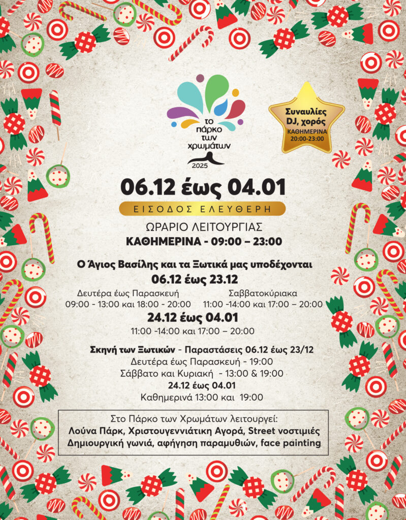 Θα υπάρχουν απίθανες εκπλήξεις στο Πάρκο των Χρωμάτων για όλους: καταστήματα Street Food με αλμυρές και γλυκές λιχουδιές, χριστουγεννιάτικη αγορά, Luna Park, παγοδρόμιο, καρουζέλ, καθημερινές συναυλίες, face painting, αφήγηση παραμυθιών και πολλά ακόμα.