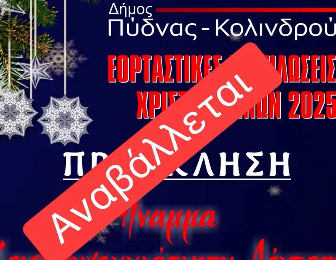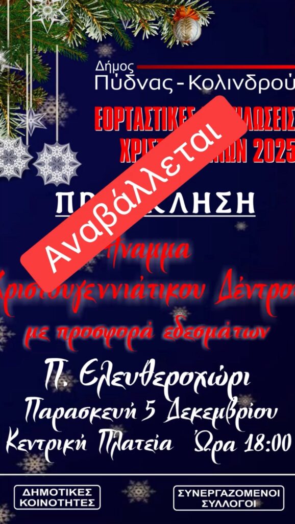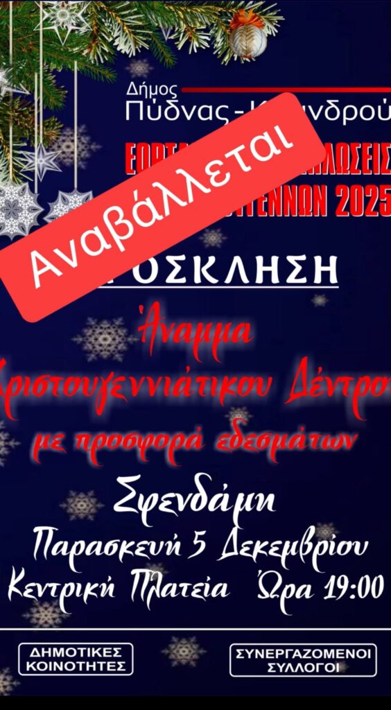 Σας ενημερώνουμε ότι οι εκδηλώσεις για το άναμμα των χριστουγεννιάτικων δέντρων στις κοινότητες της Σφενδάμης και στο Π. Ελευθεροχώρι, που ήταν προγραμματισμένες για σήμερα 5/12/2025, αναβάλλονται λόγω καιρικών συνθηκών.