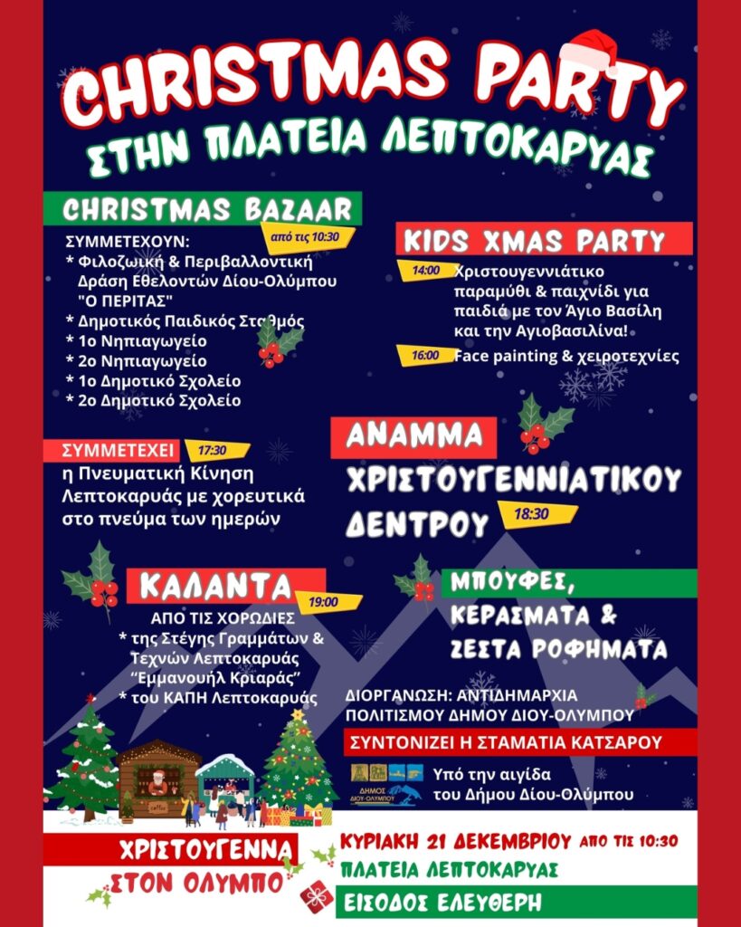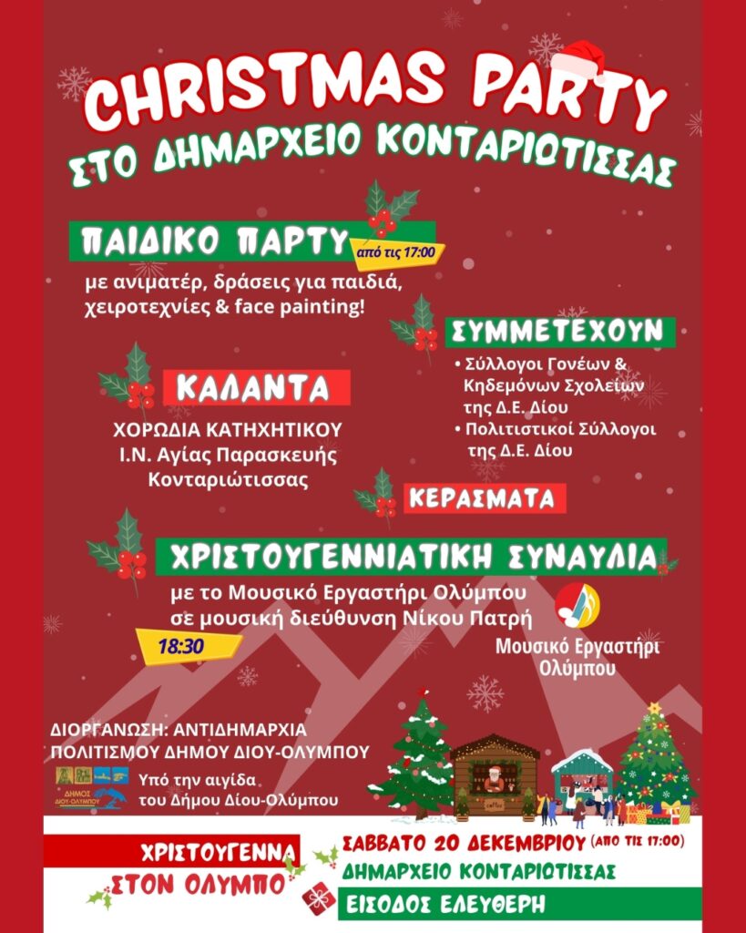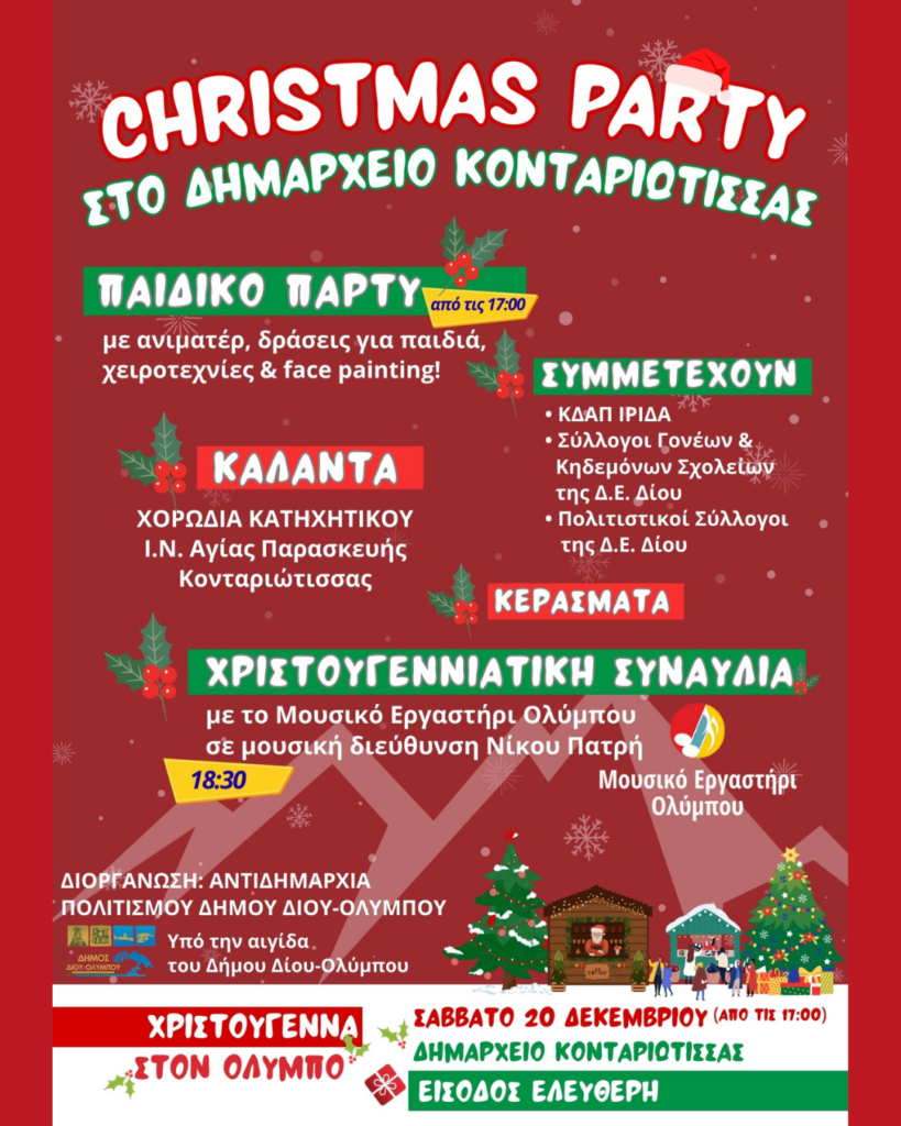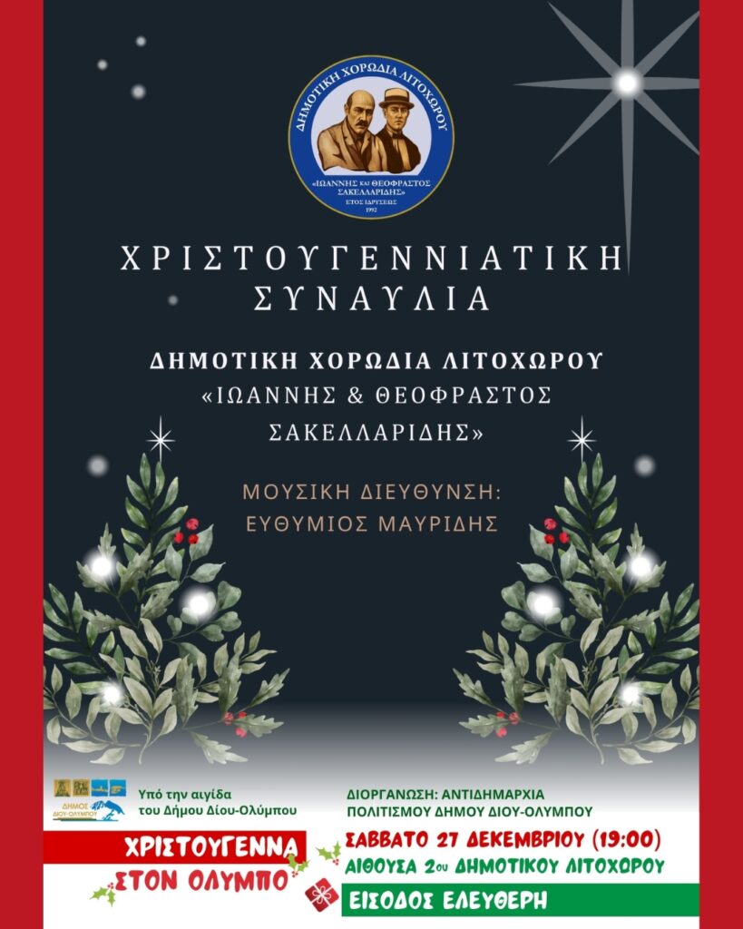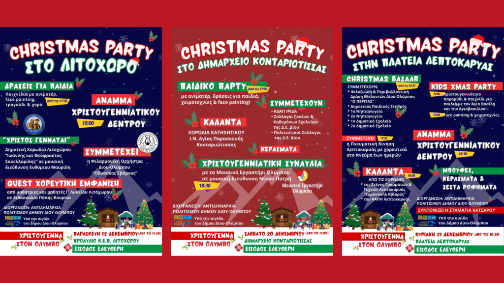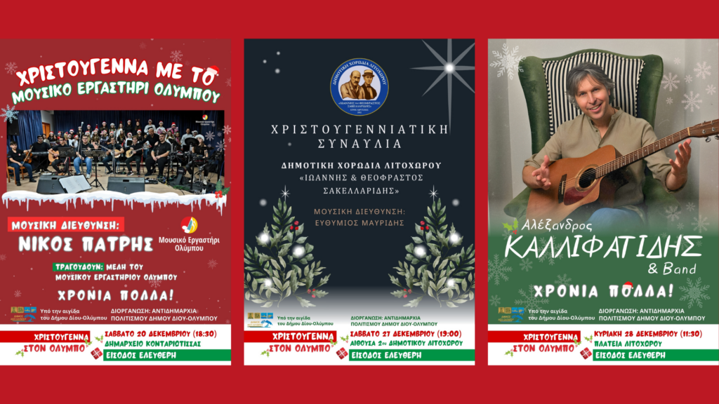 Σας προσκαλούμε στις εκδηλώσεις του Δήμου Δίου-Ολύμπου στις πρωτεύουσες των τριών δημοτικών ενοτήτων, Κονταριώτισσα, Λεπτοκαρυά και Λιτόχωρο, για να γιορτάσουμε παρέα και φέτος τα Χριστούγεννα, μουσικά και παραμυθένια.