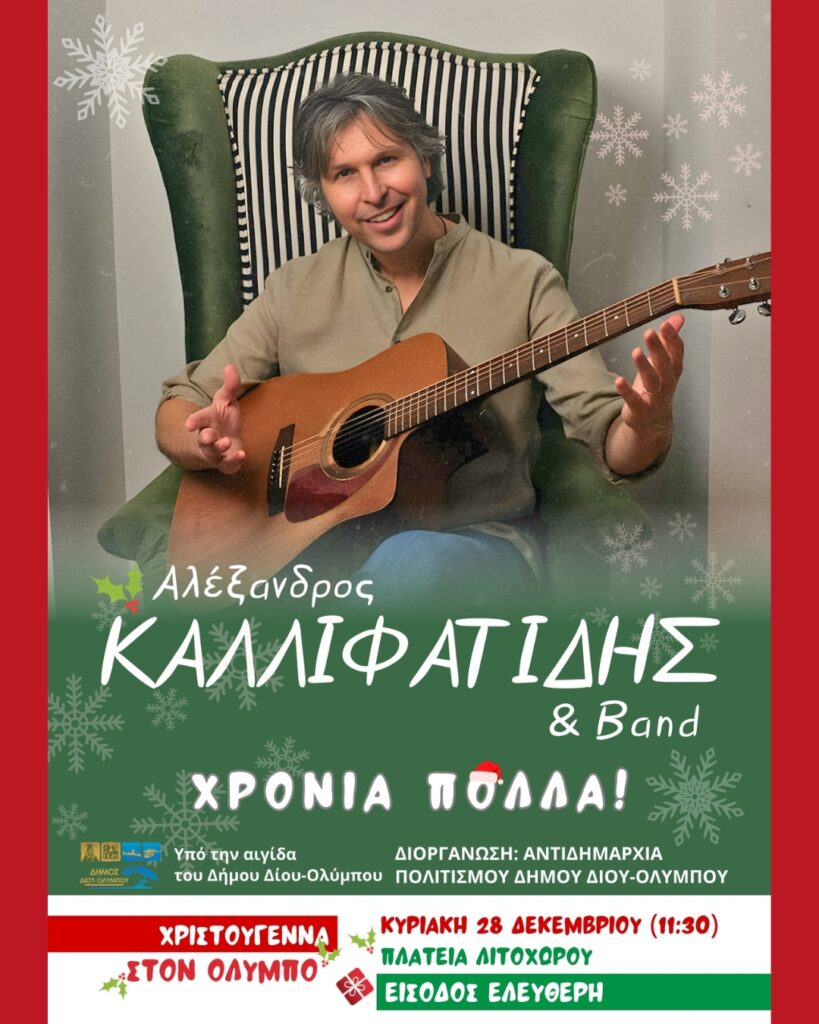11:30. Το μεσημέρι της τελευταίας Κυριακή του έτους θα γεμίσει μουσική στη συναυλία του Αλέξανδρου Καλλιφατίδη και της μπάντας του, στην πλατεία Λιτοχώρου.