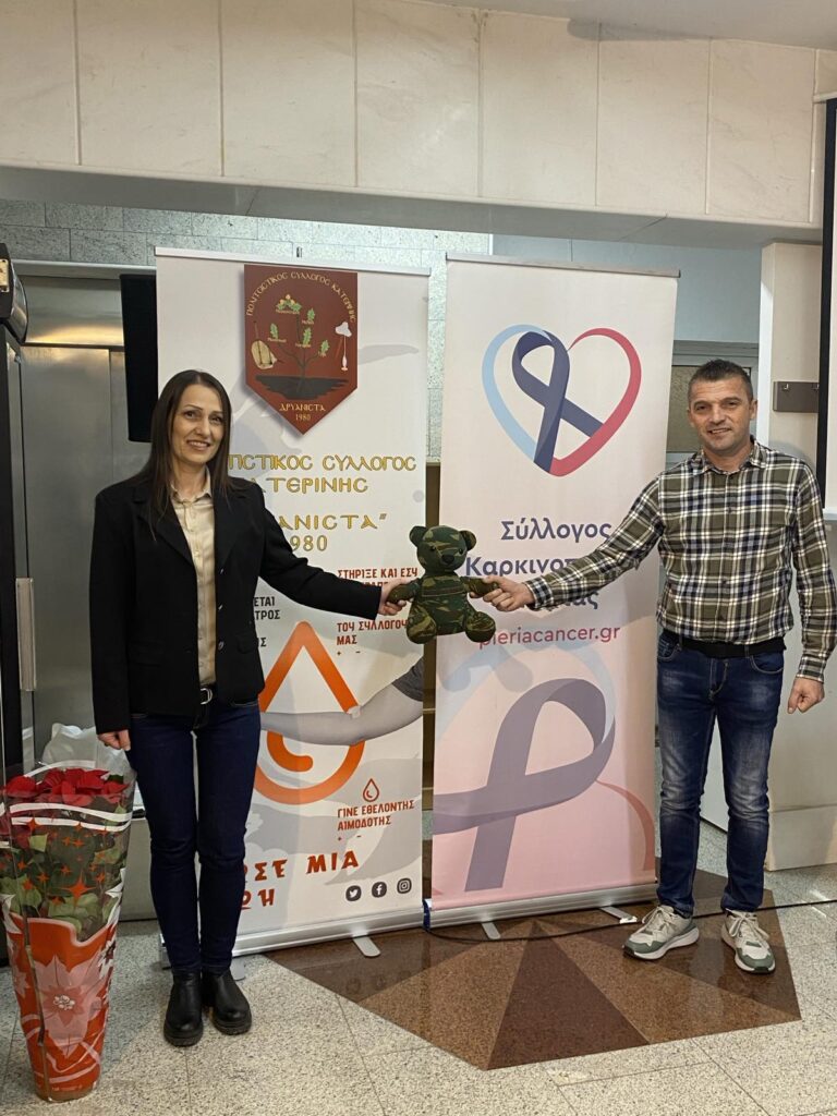 Ο Πολιτιστικός Σύλλογος «Δρυάνιστα» έδειξε έμπρακτα την αλληλεγγύη του προς τους ασθενείς που μάχονται με τον καρκίνο, προσφέροντας πέντε (5) φιάλες αίματος στον Σύλλογο Καρκινοπαθών Πιερίας. Αυτή η συμβολική αλλά και ζωτικής σημασίας πράξη, αποτελεί μια δυνατή υπενθύμιση του πόσο καθοριστική είναι η εθελοντική αιμοδοσία για κάθε ασθενή που δίνει μάχη για τη ζωή του.