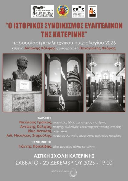 H Αντιδημαρχία Πολιτισμού του Δήμου Κατερίνης, οι Φίλοι του Μουσείου Πόλης Κατερίνης, η Εστία Πιερίδων Μουσών Κατερίνης και οι εκδόσεις Οξύνοια σας προσκαλούν στην παρουσίαση του καλλιτεχνικού ημερολογίου 2026 “Ο ΙΣΤΟΡΙΚΟΣ ΣΥΝΟΙΚΙΣΜΟΣ ΕΥΑΓΓΕΛΙΚΩΝ ΤΗΣ ΚΑΤΕΡΙΝΗΣ”, με εμπεριστατωμένα κείμενα-σχόλια του ποιητή, φιλόλογου, ερευνητή της τοπικής ιστορίας Αντώνη Κάλφα και 37 καλλιτεχνικές φωτογραφίες του καλλιτεχνικού φωτογράφου Παναγιώτη Φτάρα.